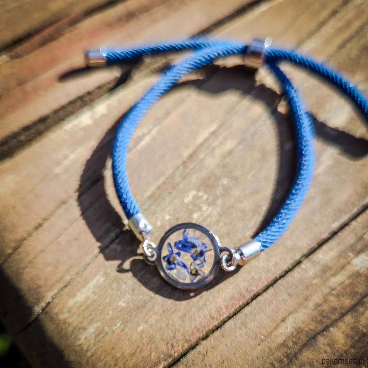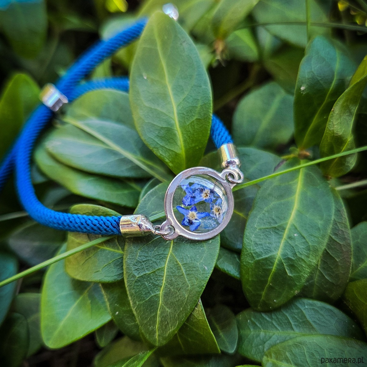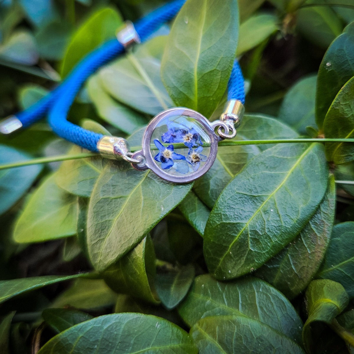 Bransoletka z oczkiem z zatopionymi w żywicy epoksydowej niezapominajkami. Oczko: 14 mm