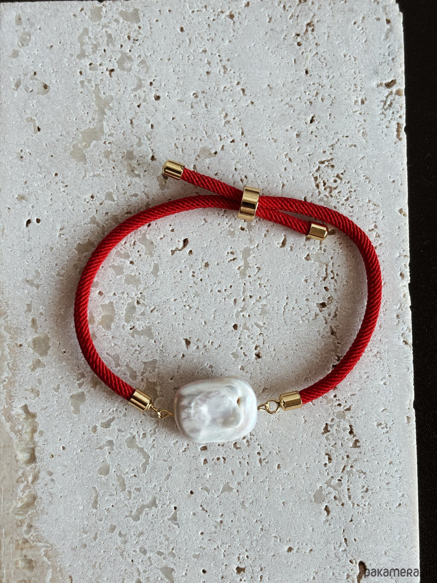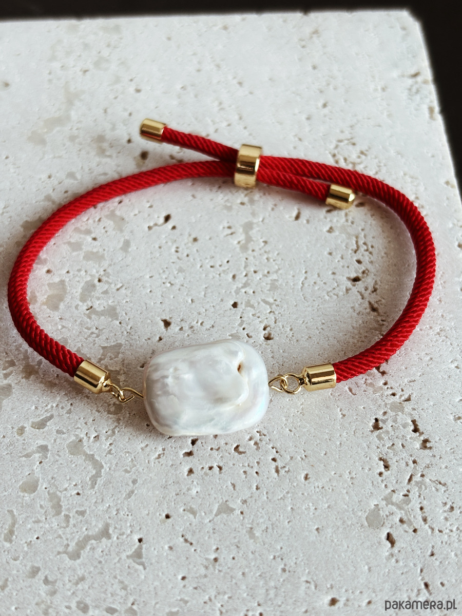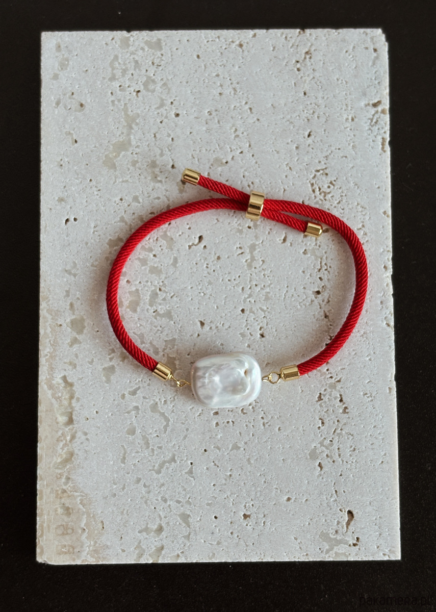 Bransoletka wykonana jest na regulowanym sznurku, ze złotymi elementami i perłą naturalną.