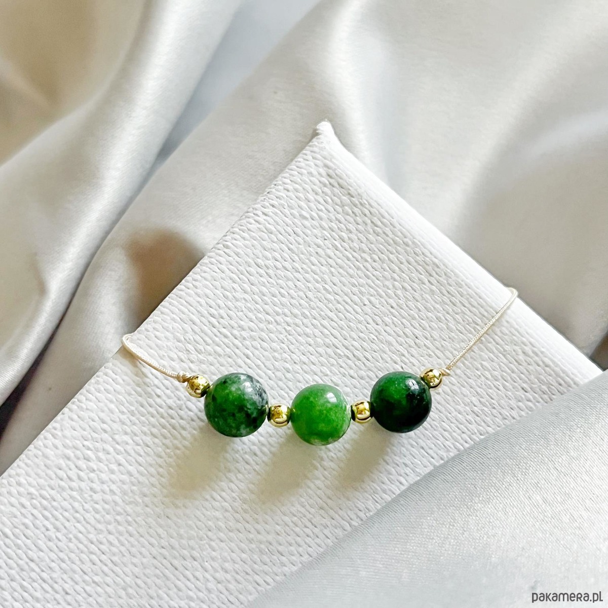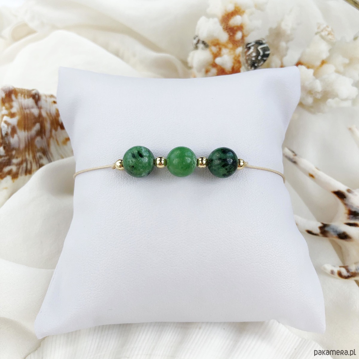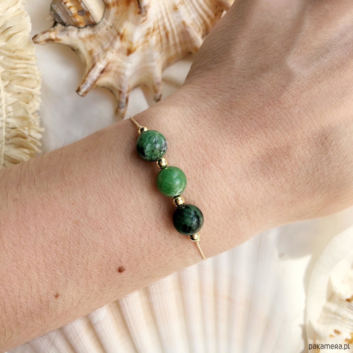 Zdobią ją kamienie naturalne: 3 zielone zoisyty 8 mm przekładane hematytami 3 mm.