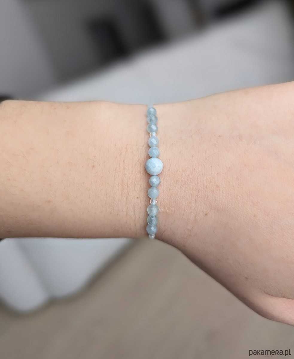 Bransoletka na turkusowej nici Aqua powstała ze starannie dobranych, niebieskich akwamarynów i srebrnych półfabrykatów. Kamienie naturalne pięknie współgrają zarówno z ostrym światłem naturalnym, jak i miękkim oświetleniem wewnątrz pomieszczeń. Aqua to bliska kuzynka Laguny - utrzymana jest jednak w konkretnych odcieniach błękitu, bez domieszki zieleni.