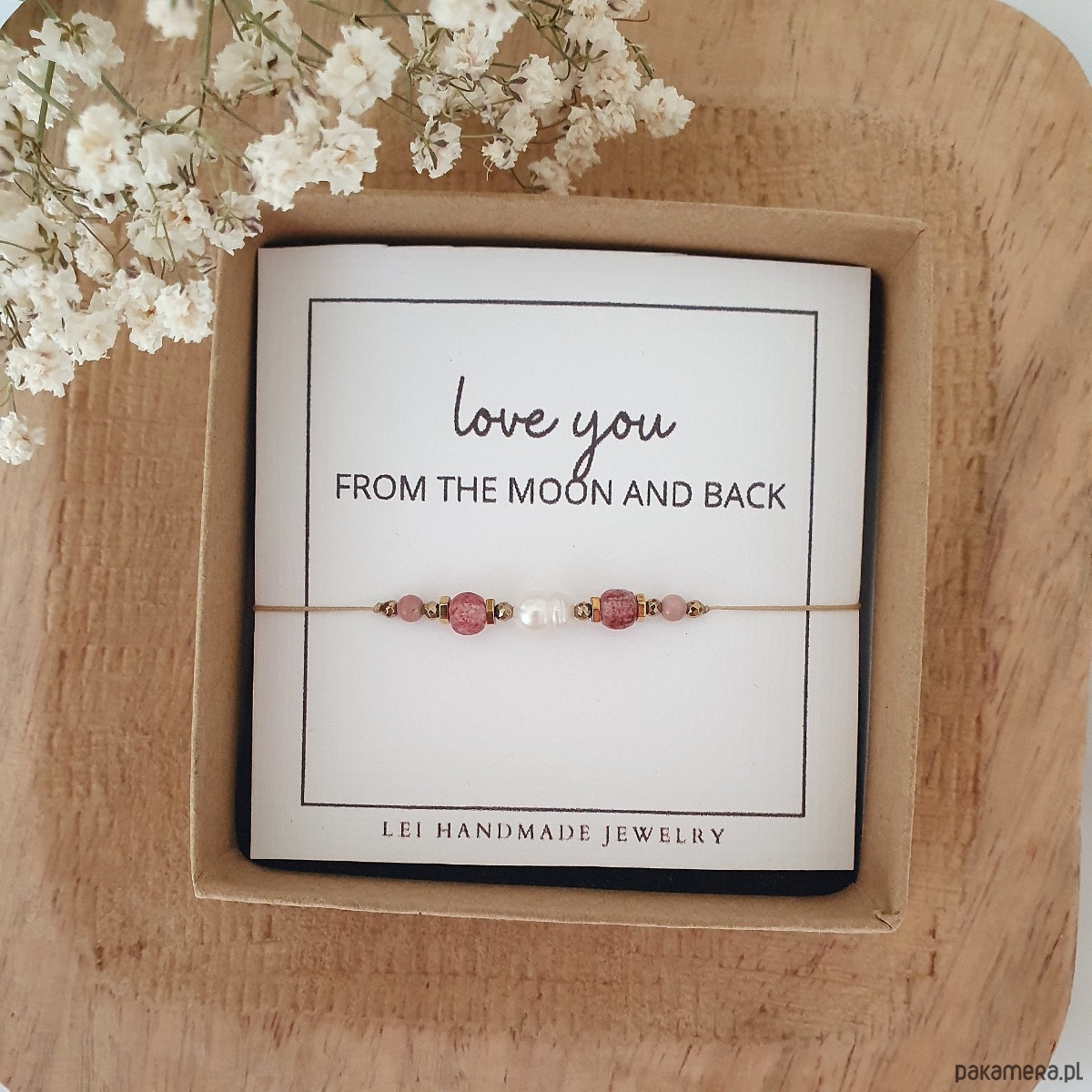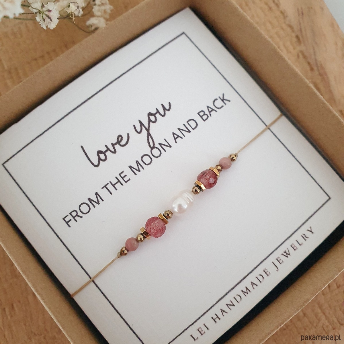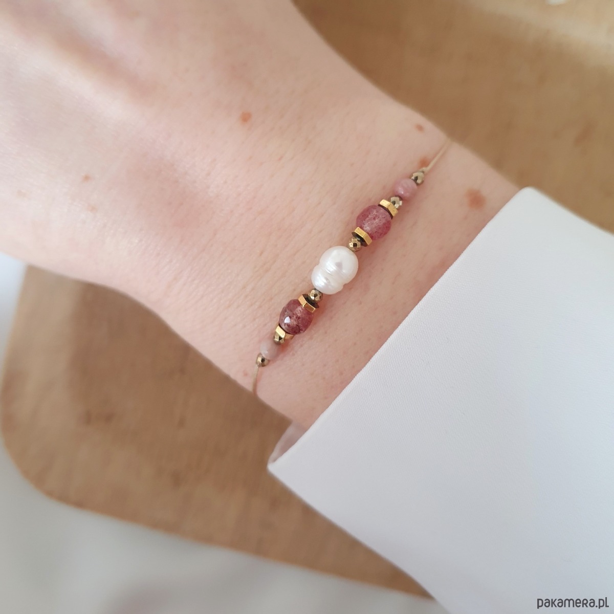 Bransoletka na NA WALENTYNKI wykonana ręcznie z kamieni naturalnych PERŁY RZECZNEJ, KWARCU TRUSKAWKOWEGO, RODONITU i HEMATYTU na subtelnej nici jubilerskiej w kolorze beżowym.