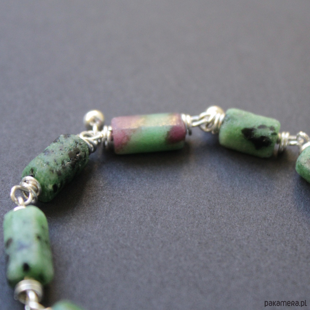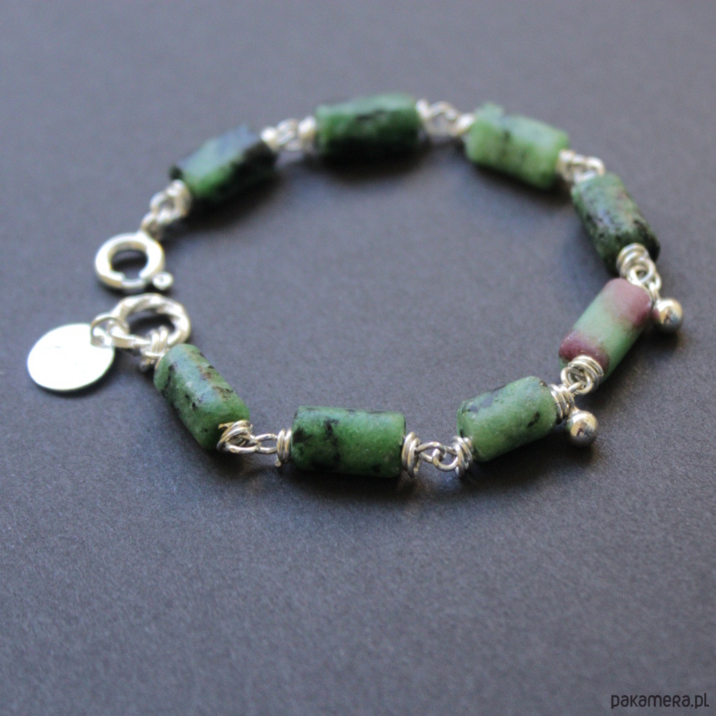 Niezwykłej urody bransoletka została wykonana ze srebra próby 925 oraz bryłek pięknego surowego zoisydu z czarnym turmalinem oraz rubinem.