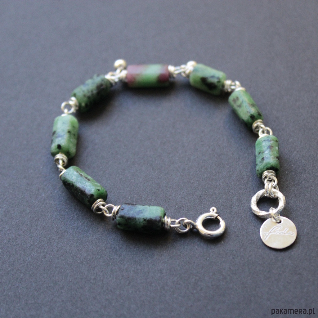 Niezwykłej urody bransoletka została wykonana ze srebra próby 925 oraz bryłek pięknego surowego zoisydu z czarnym turmalinem oraz rubinem.