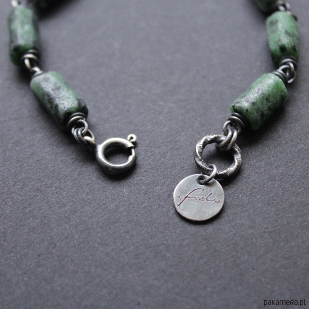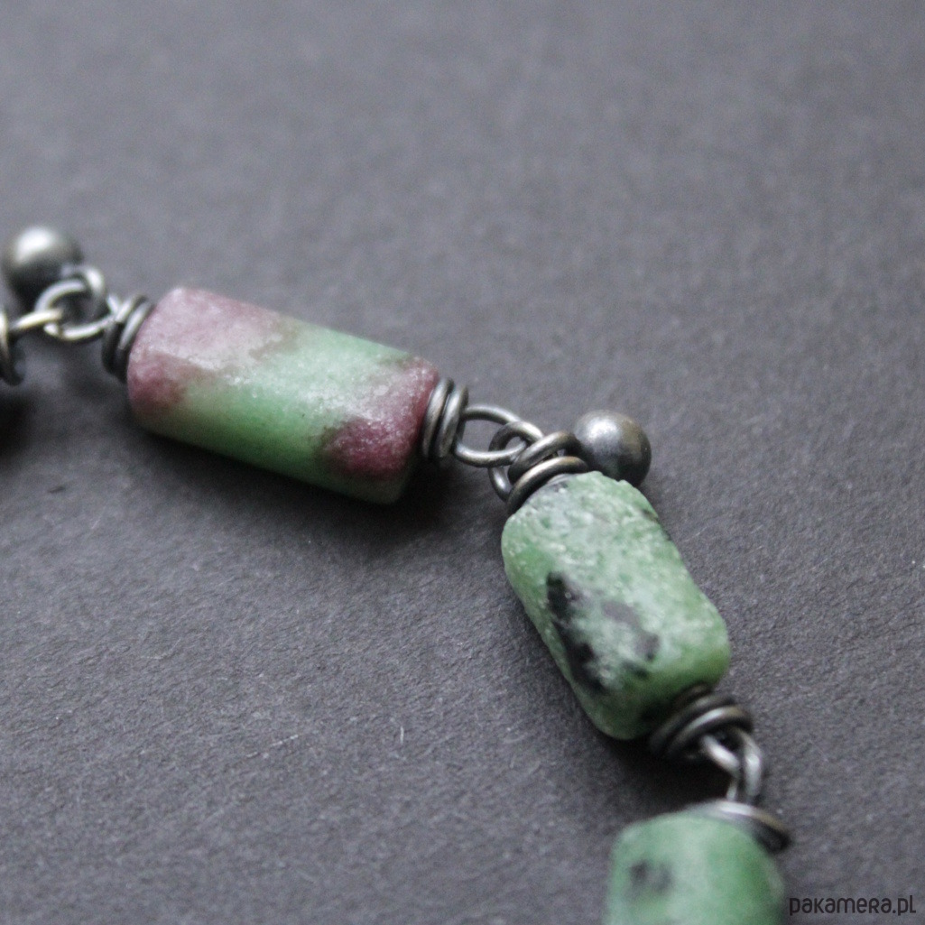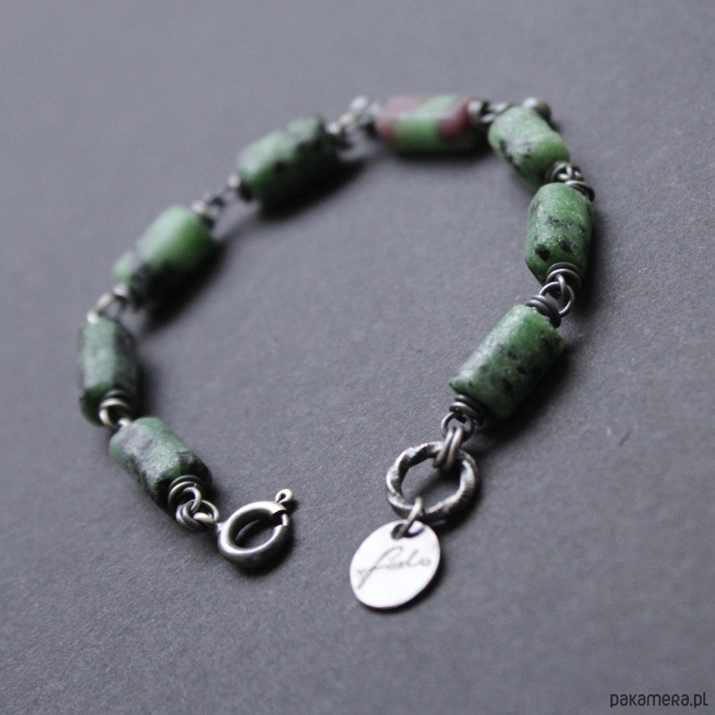 Niezwykłej urody bransoletka została wykonana z oksydowanego srebra próby 925 oraz bryłek pięknego surowego zoisydu z czarnym turmalinem oraz rubinem.
