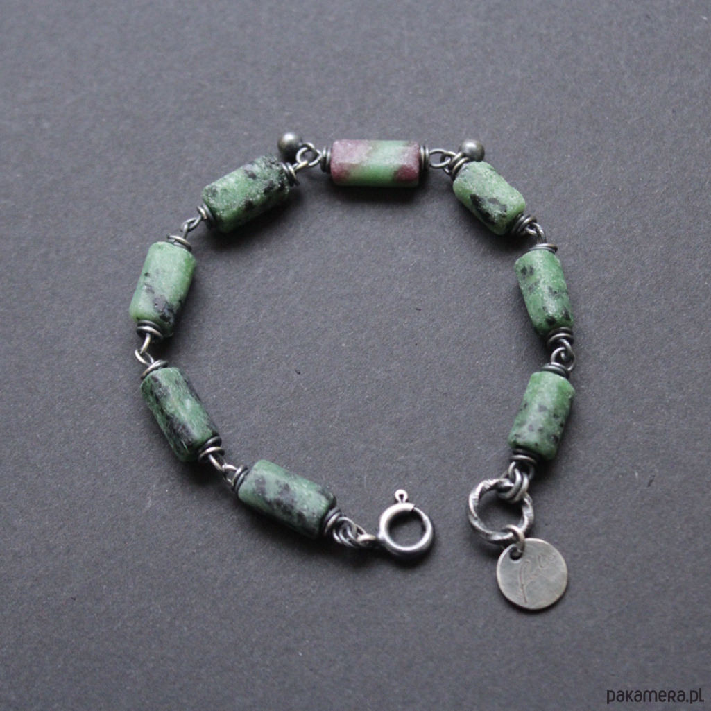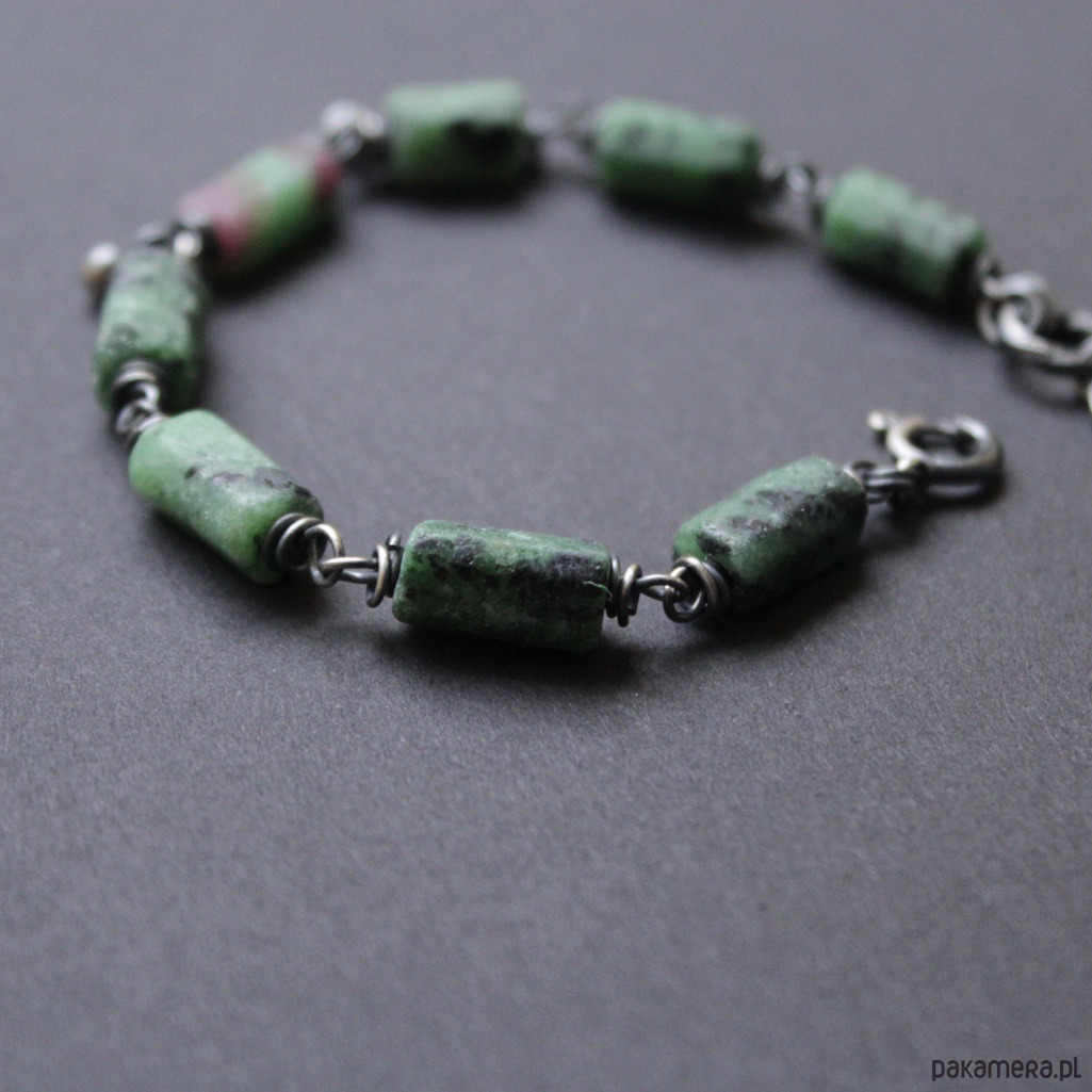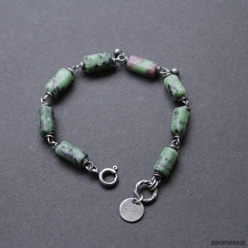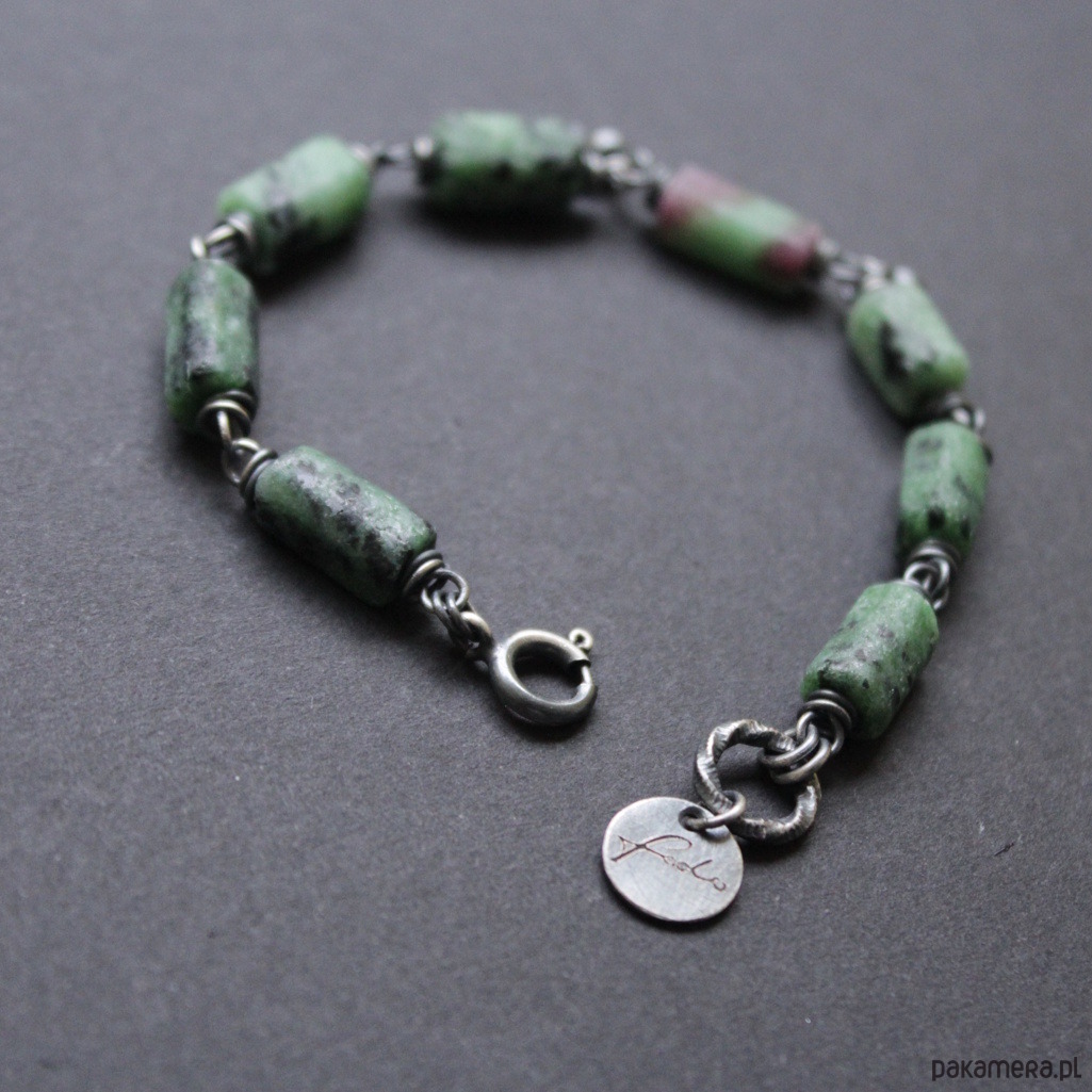Niezwykłej urody bransoletka została wykonana z oksydowanego srebra próby 925 oraz bryłek pięknego surowego zoisydu z czarnym turmalinem oraz rubinem.