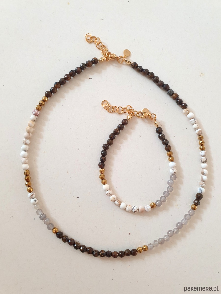W tej - kulka bronzyt, kwarc dymny, howlit kremowy, złoty hematyt.