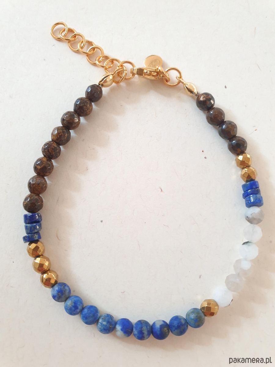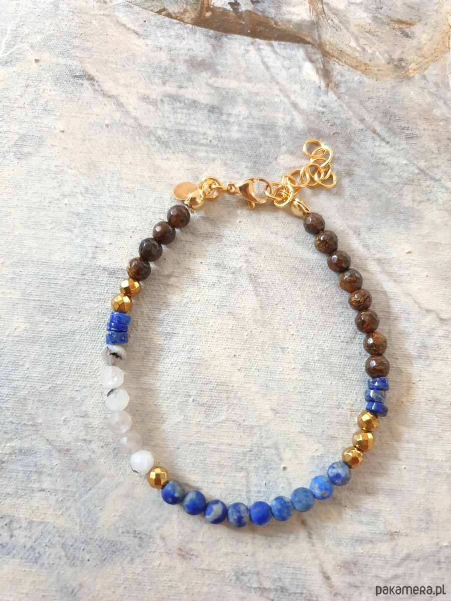 Minimalistyczna bransoletka tworzona ręcznie z kamieni naturalnych, elementów ze stali szlachetnej (antyalergicznej) złoconej. W tej - lapis lazuli, bronzyt, kamień księżycowy. Do bransoletki można dokupić naszyjnik dostępny w naszym sklepie.