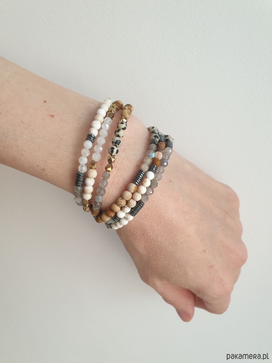 W tej - fasetowany labradoryt, kamień księżycowy, kulka howlit kremowy, hematyt grafitowy.