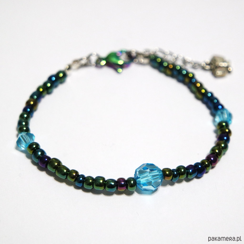Oryginalna bransoletka cudnie mieniąca się w odcieniach granatu, zieleni, turkusu, złota oraz fioletu i amarantu. Tworzy się przepiękny efekt tęczowego przejścia kolorów.