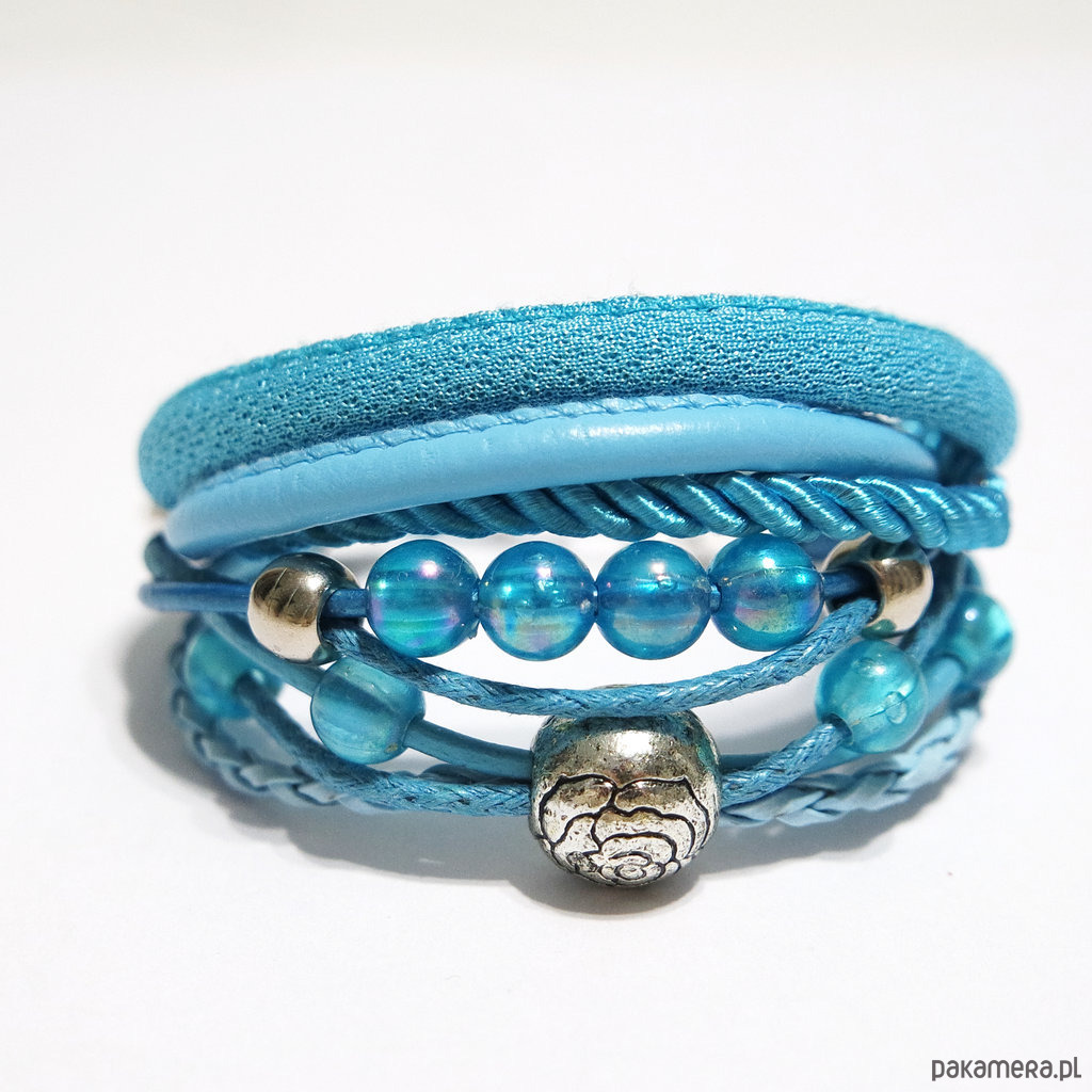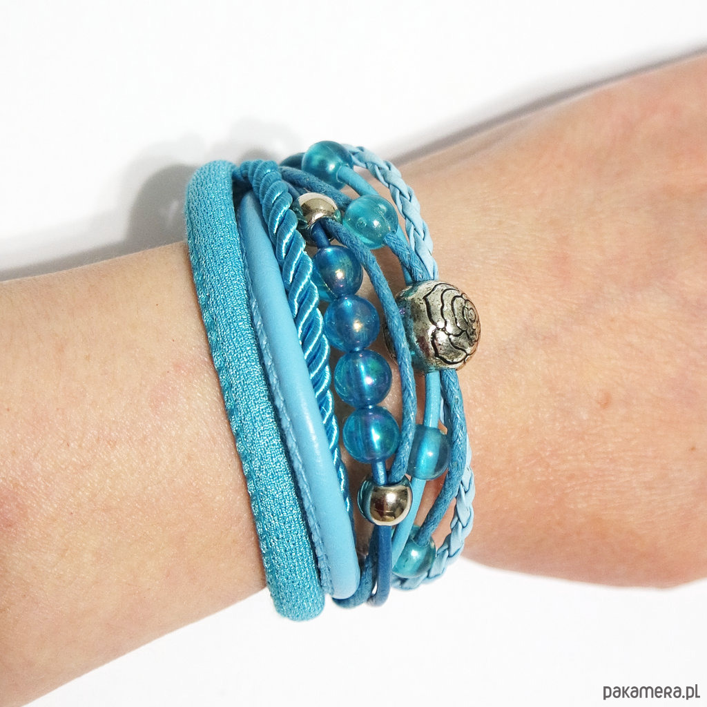 Bransoletka zrobiona jest z rzemieni ze skóry naturalnej, ekologicznej, materiału, sznurków oraz przekładek i koralików.