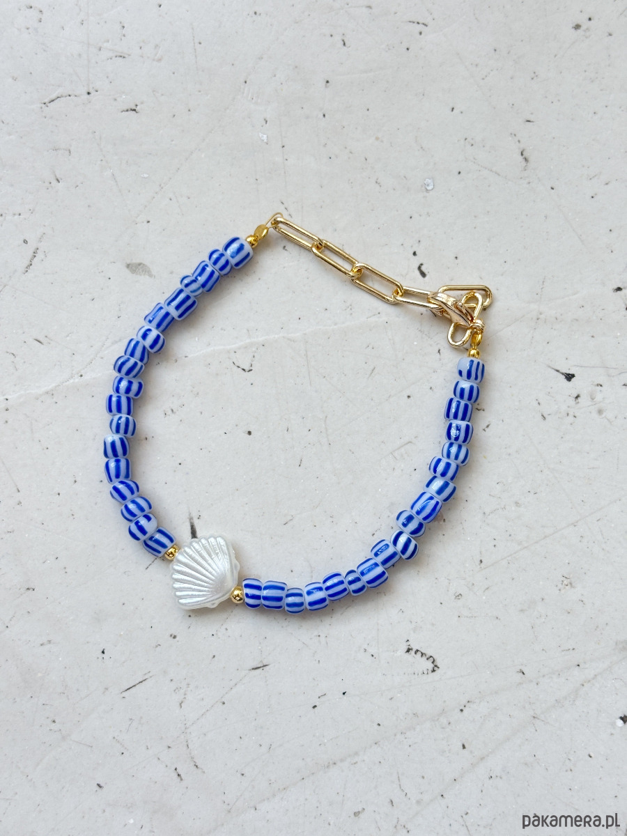 Bransoletka wykonana z drobnych, niebieskich koralików oraz ozdobnej muszelki. Elementy metalowe wykonane są ze stali chirurgicznej, a regulowany łańcuszek pozwala dopasować długość.