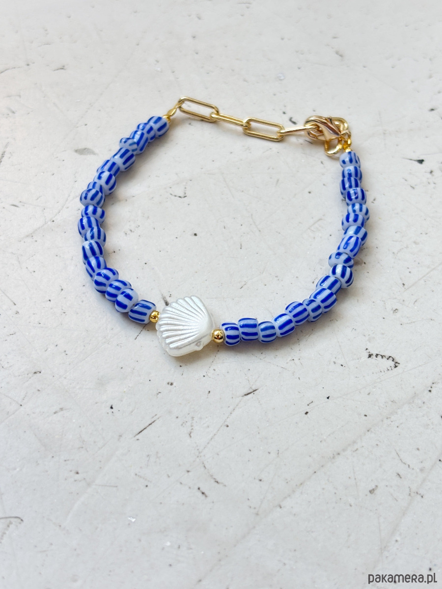 Bransoletka z koralików, niebieska bransoletka damska, bransoletka z muszelką, letnia bransoletka damska, bransoletka wakacyjna,