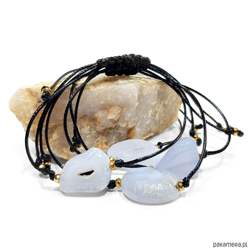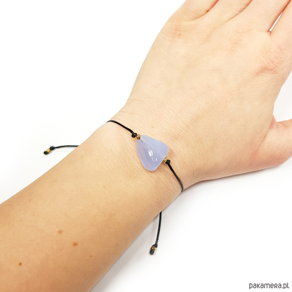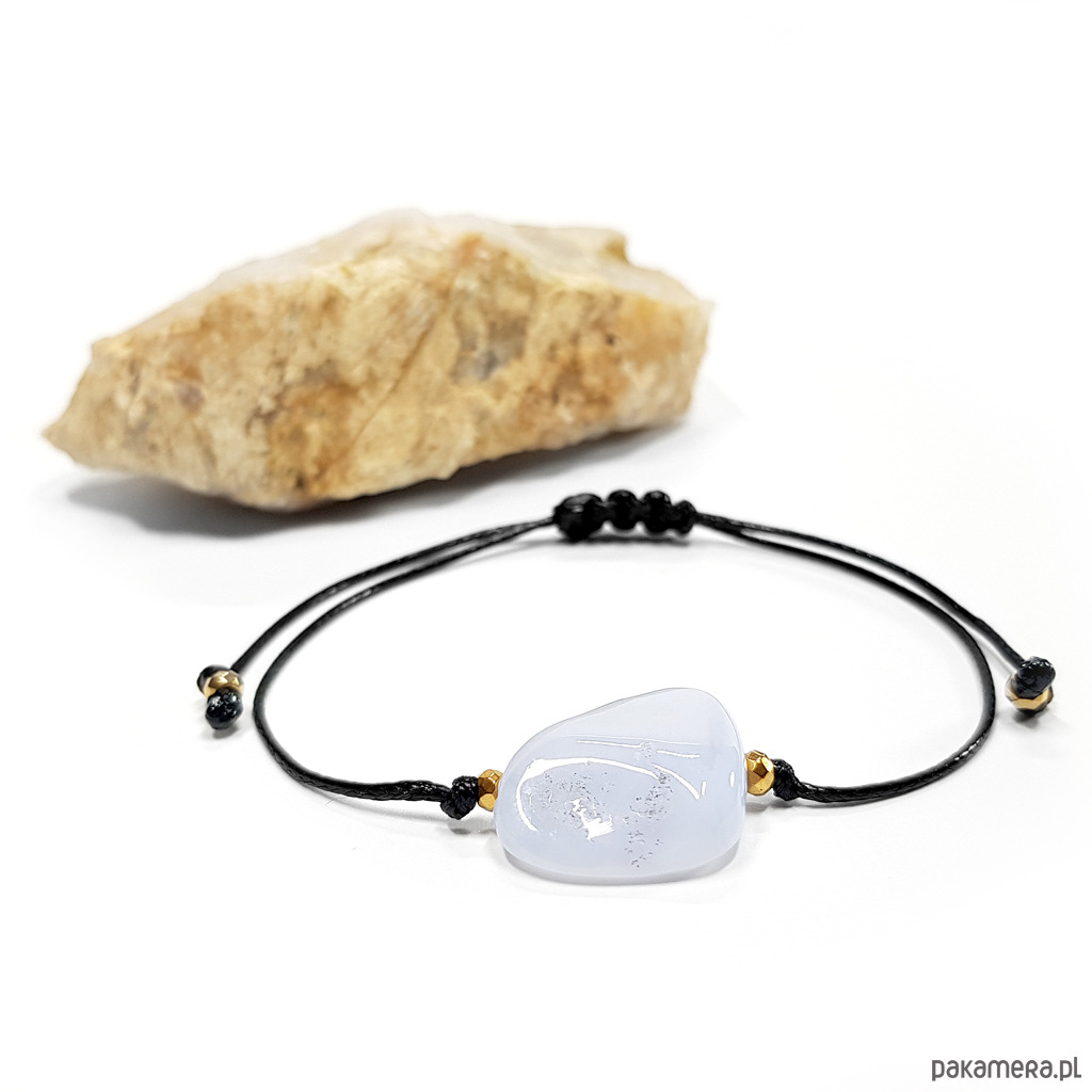Bransoletka wykonana z polerowanej bryłki niebieskiego agatu, hematytów oraz nylonowego sznureczka. Bransoletka będzie odpowiednia na nadgarstek o obwodzie 12-17 cm.
