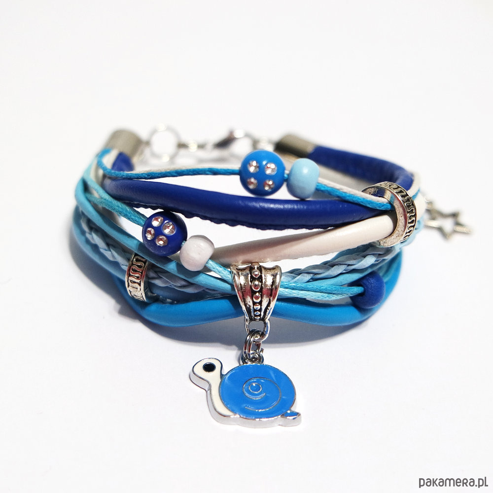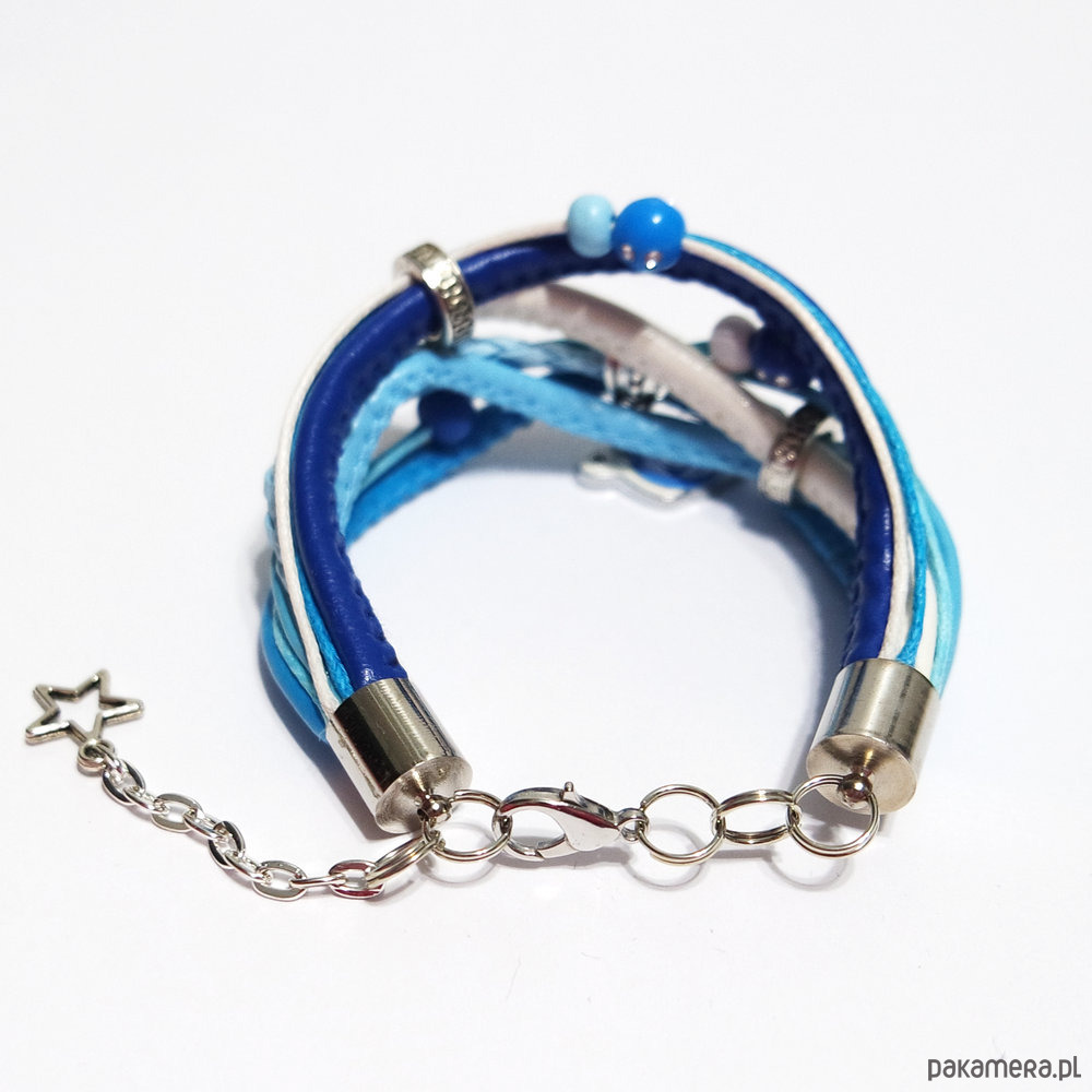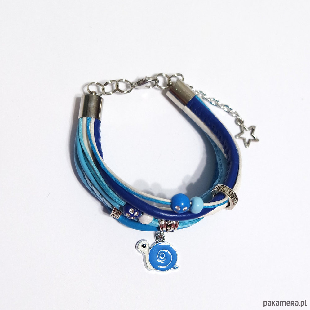 Bransoletka zrobiona jest z rzemieni z eko-skóry, skóry, sznurka, koralików oraz przekładek i emaliowanej zawieszki.