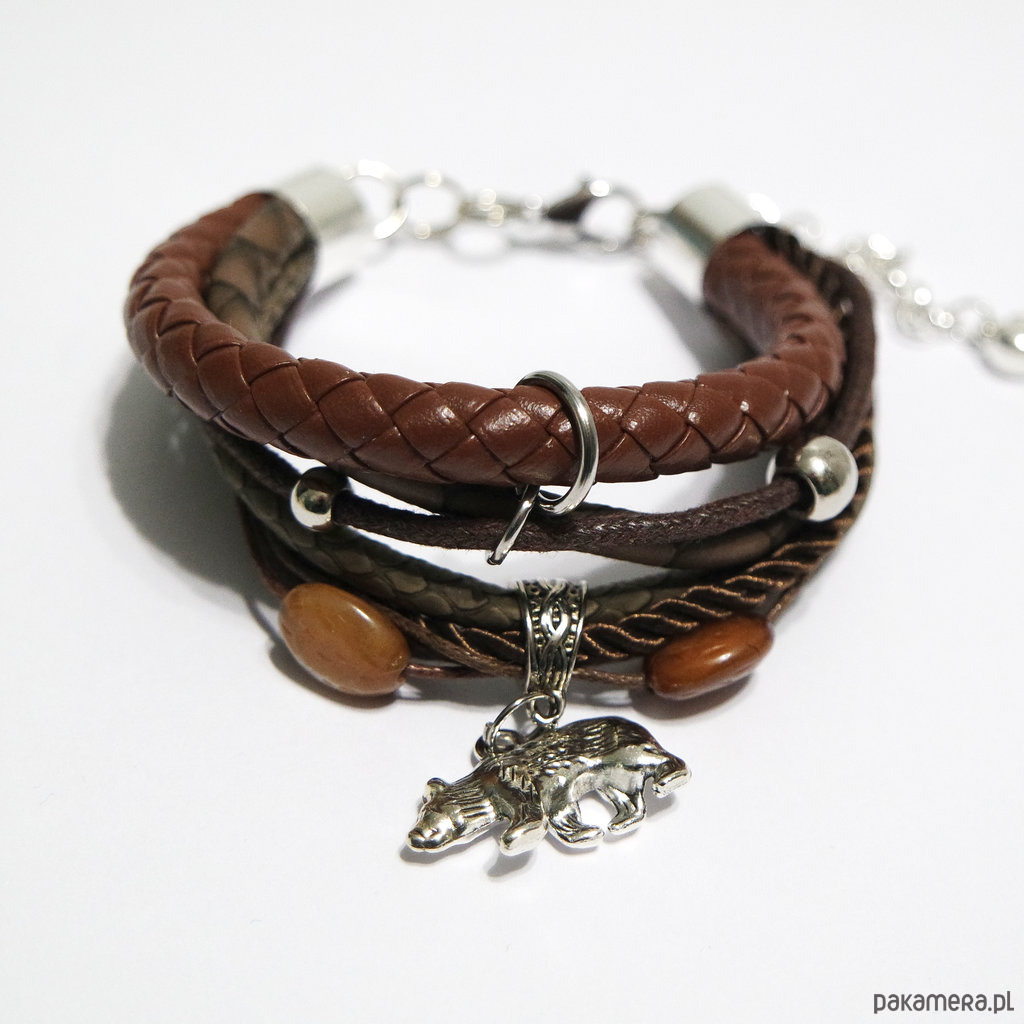 Bransoletka zrobiona jest z rzemieni ze skóry ekologicznej, sznurka oraz przekładek, koralików i zawieszki.