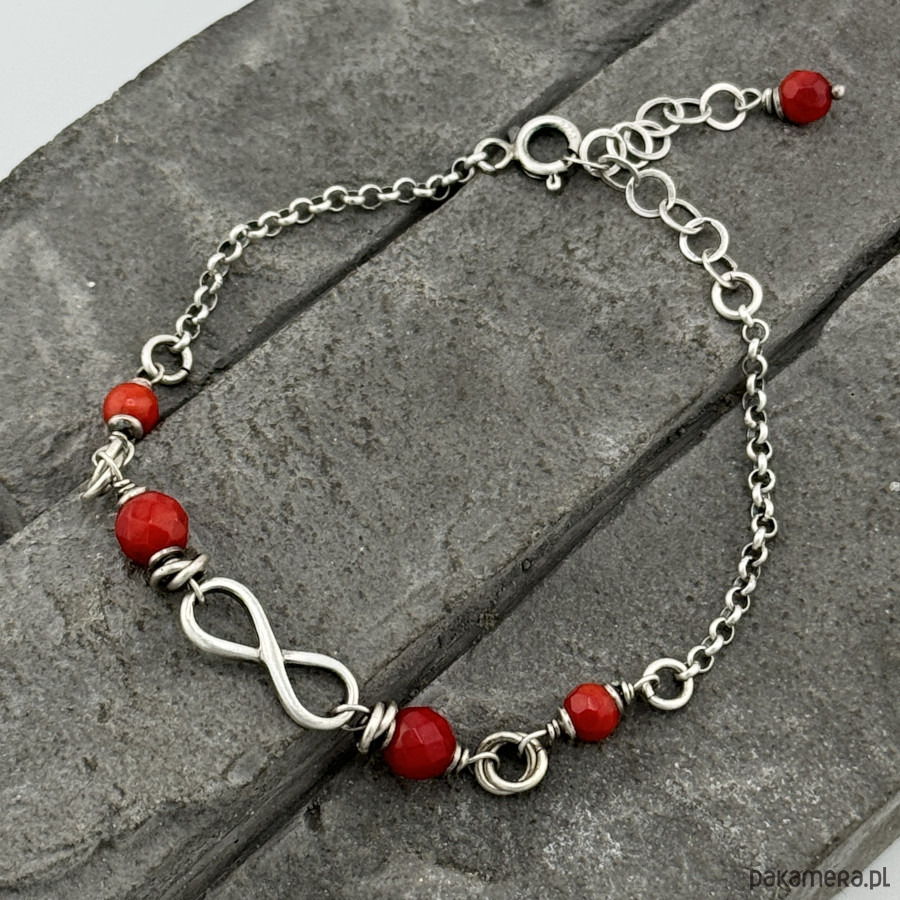 Kobieca, subtelna bransoletka na co dzień z motywem nieskończoności. Wykonana w całości ze srebra próby 925 oraz fasetowanych kulek czerwonego korala wielkosci 6 i 4 mm. Całkowita długość bransoletki regulowana 16 - 20 cm. W mojej galerii kolczyki do kompletu. Ozdobnie zapakowana.