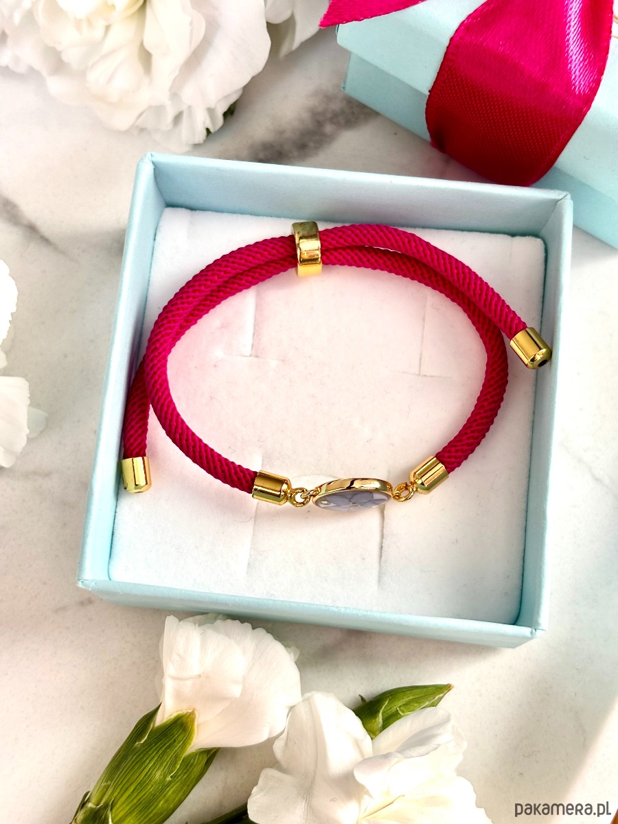Ozdobne zapięcie z regulacją, składa się z 2 sznurków w kolorze fuksji po 10 cm. Na sznurkach zamontowana jest przesuwna metalowa oponka 8x4 mm, która służy do regulowania długości bransoletki oraz jako blokada zapięcia