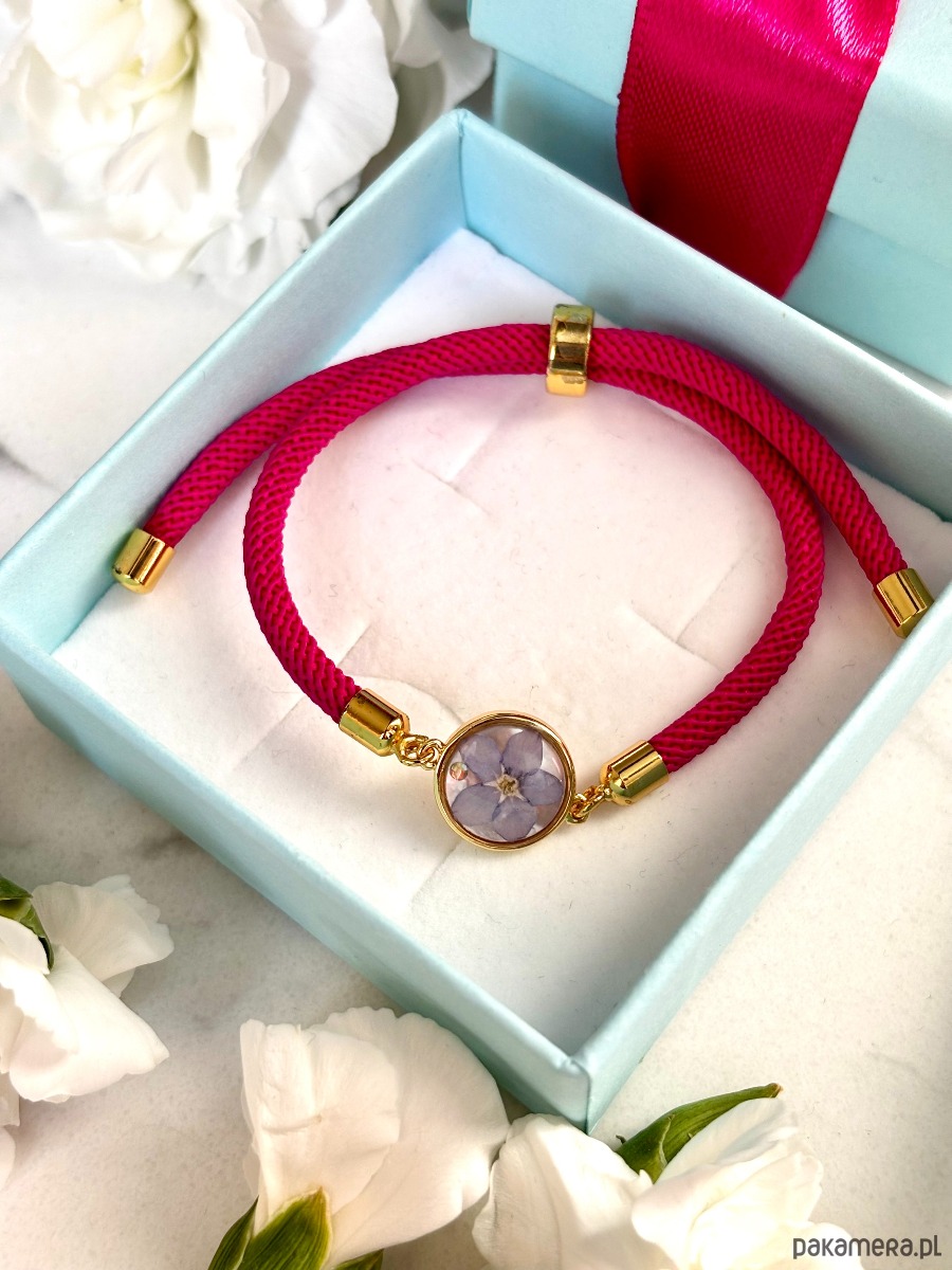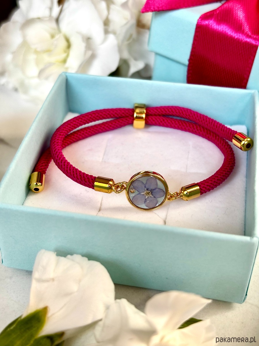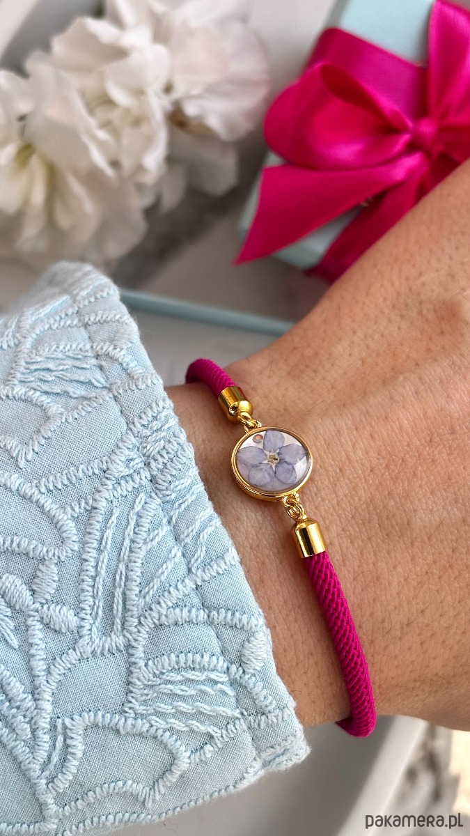 Fuksjowy, pleciony sznurek tworzy modny kontrast z jasnym kwiatem i złotymi detalami. Dzięki temu bransoletka przyciąga wzrok i doskonale sprawdzi się jako wyrazisty akcent stylizacji – zarówno codziennej, jak i eleganckiej. To idealna propozycja dla kobiet, które cenią biżuterię handmade z kwiatów, styl slow fashion oraz dodatki z duszą.