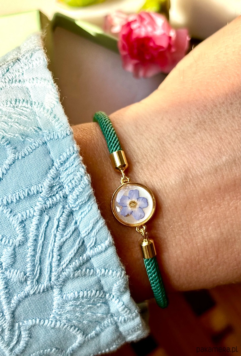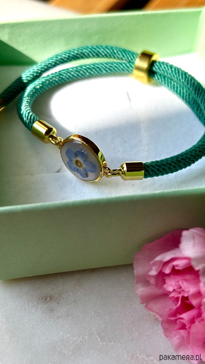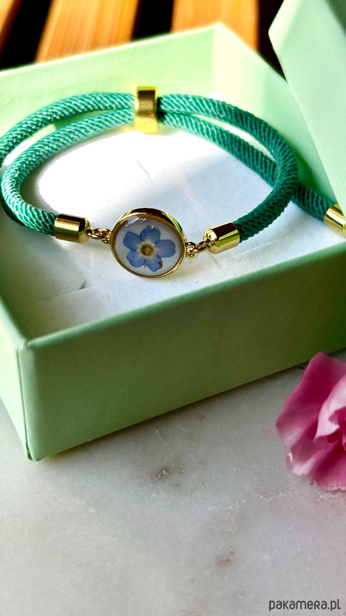 Ręcznie wykonana bransoletka z prawdziwych kwiatów i naturalnych elementów. Bransoletka z suszonym kwiatem niezapominajki na tle z masy perłowej.