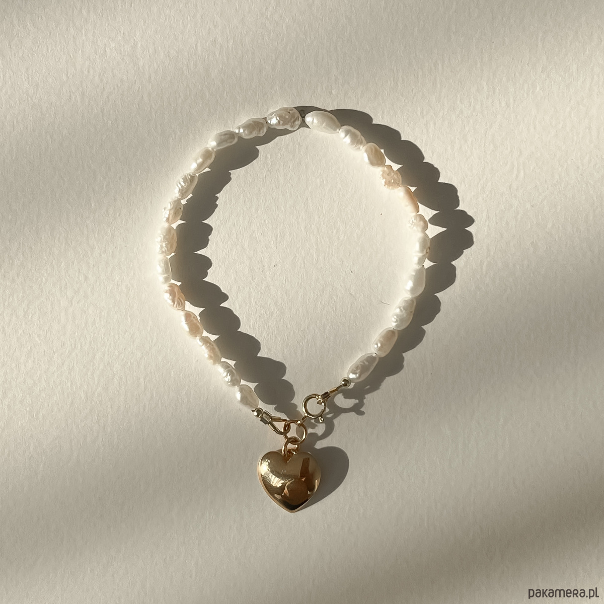 Bransoletka z zapięciem tradycyjnym , wykonana perły naturalnej oraz zawieszki serca o wymiarach : ok.13 mm.