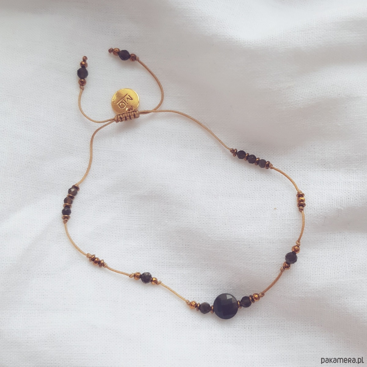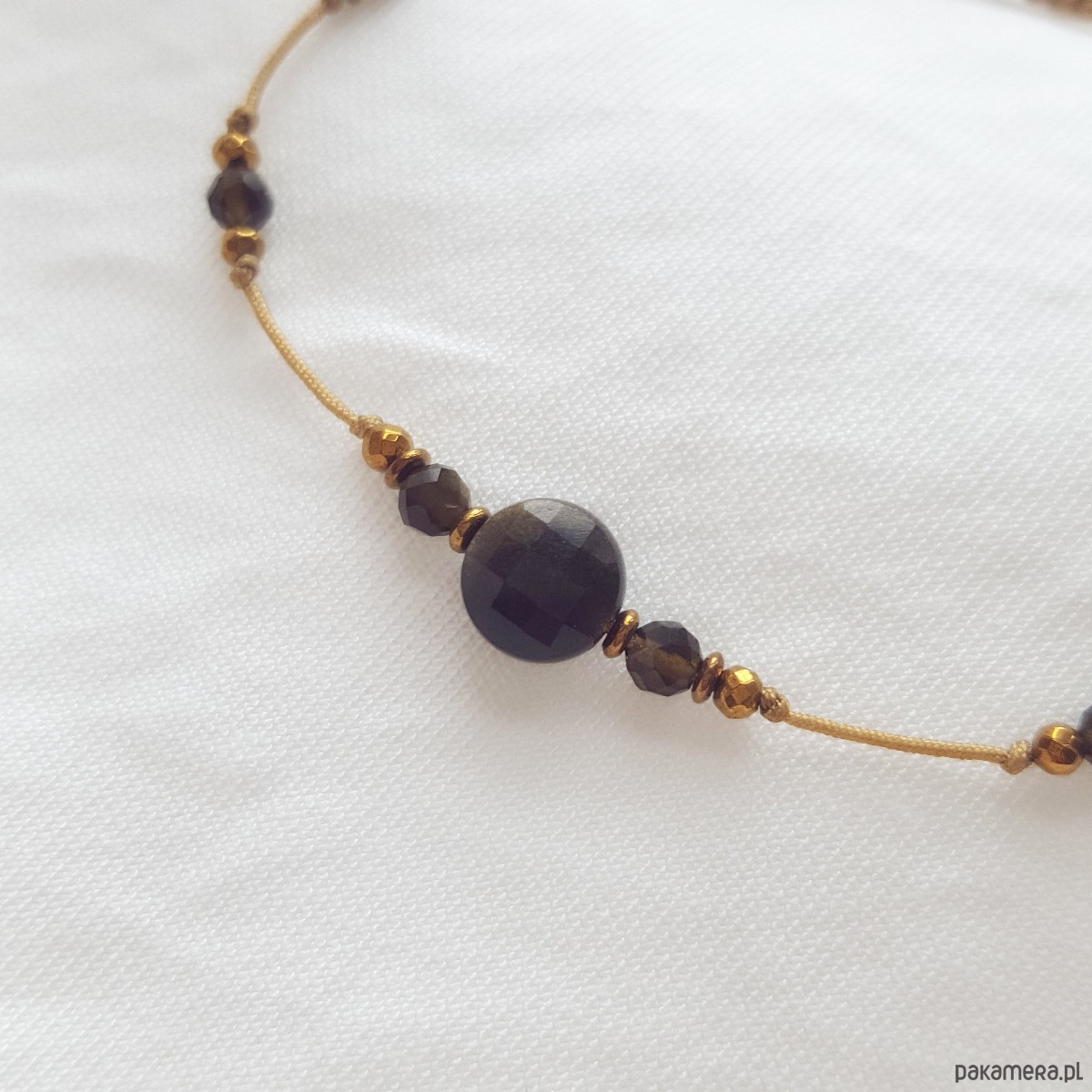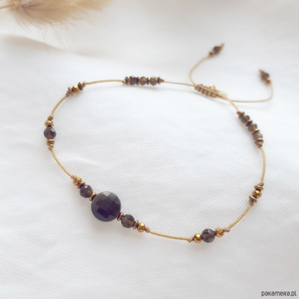 Elegancka bransoletka z kamieni złotego obsydianu i hematytów. Ta minimalistyczna bransoletka wykonana jest z beżowego, jubilerskiego sznurka, przez który przewlekliśmy kamienie w kilku różnych sekwencjach. Każda sekwencja łączy w sobie kolor ciemnej zieleni i złoty, a kamienie blokują drobne supełki. W centrum bransoletki znajduje się duże, płaskie oczko z obsydiany, a po jego bokach znajduje się drobniejszy obsydian i hematyty. Wszystkie kamienie są fasetowane, dzięki czemu pięknie błyszczą i odbijają światło. Bransoletka ma regulowaną wielkość, więc będzie dobra na każdy rozmiar nadgarstka. Zapięcie to pleciona makrama, którą przyozdabia okrągła blaszka z logo MiO (srebro pozłacane 24k. złotem).