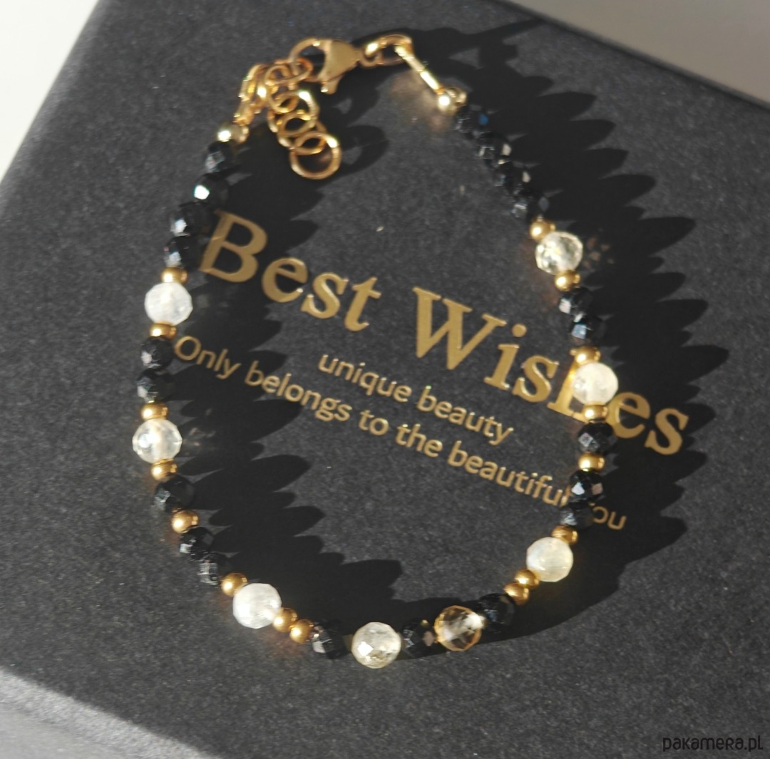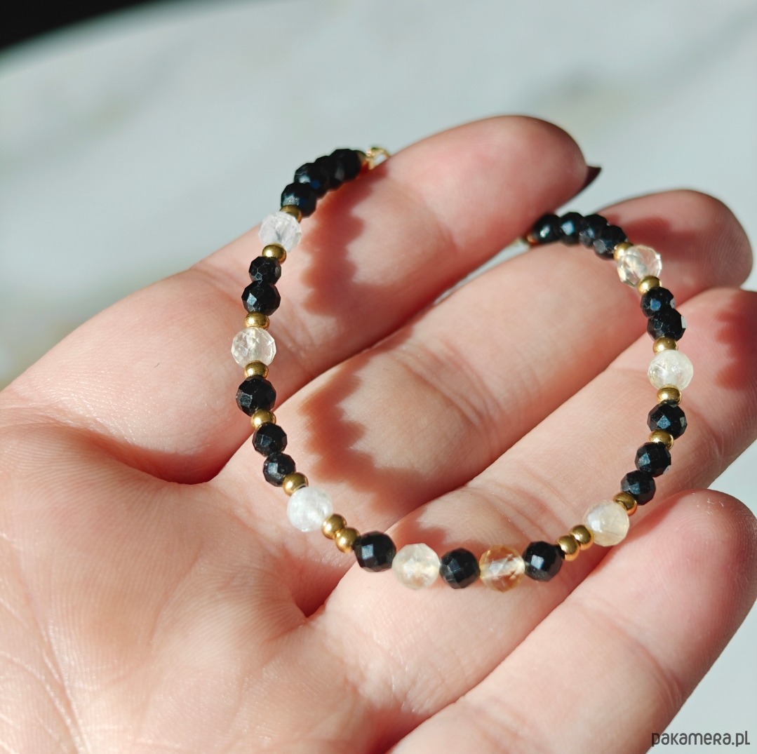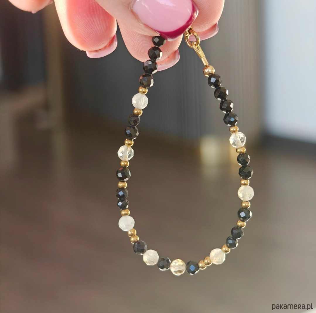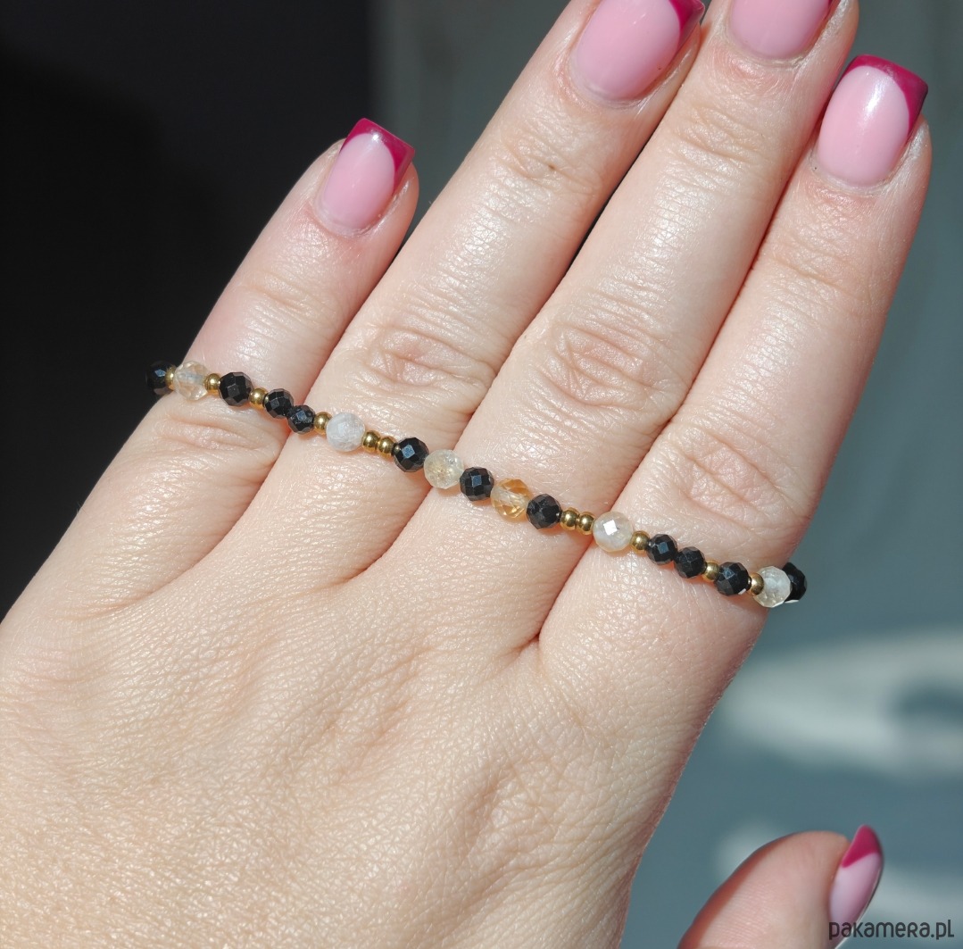 Bransoletka wykonana z połączenia turmalinu i cytrynu, tworzących elegancki kontrast ciemnych i jasnych tonów. Długość bransoletki to 16,5 cm + 2 cm przedłużki, dzięki czemu wygodnie dopasowuje się do nadgarstka. Całość uzupełniają elementy ze stali chirurgicznej oraz drobne akcenty ze srebra pozłacanego, które dodają subtelnego blasku.