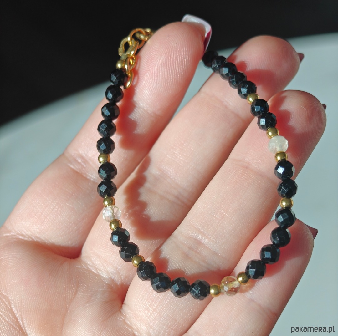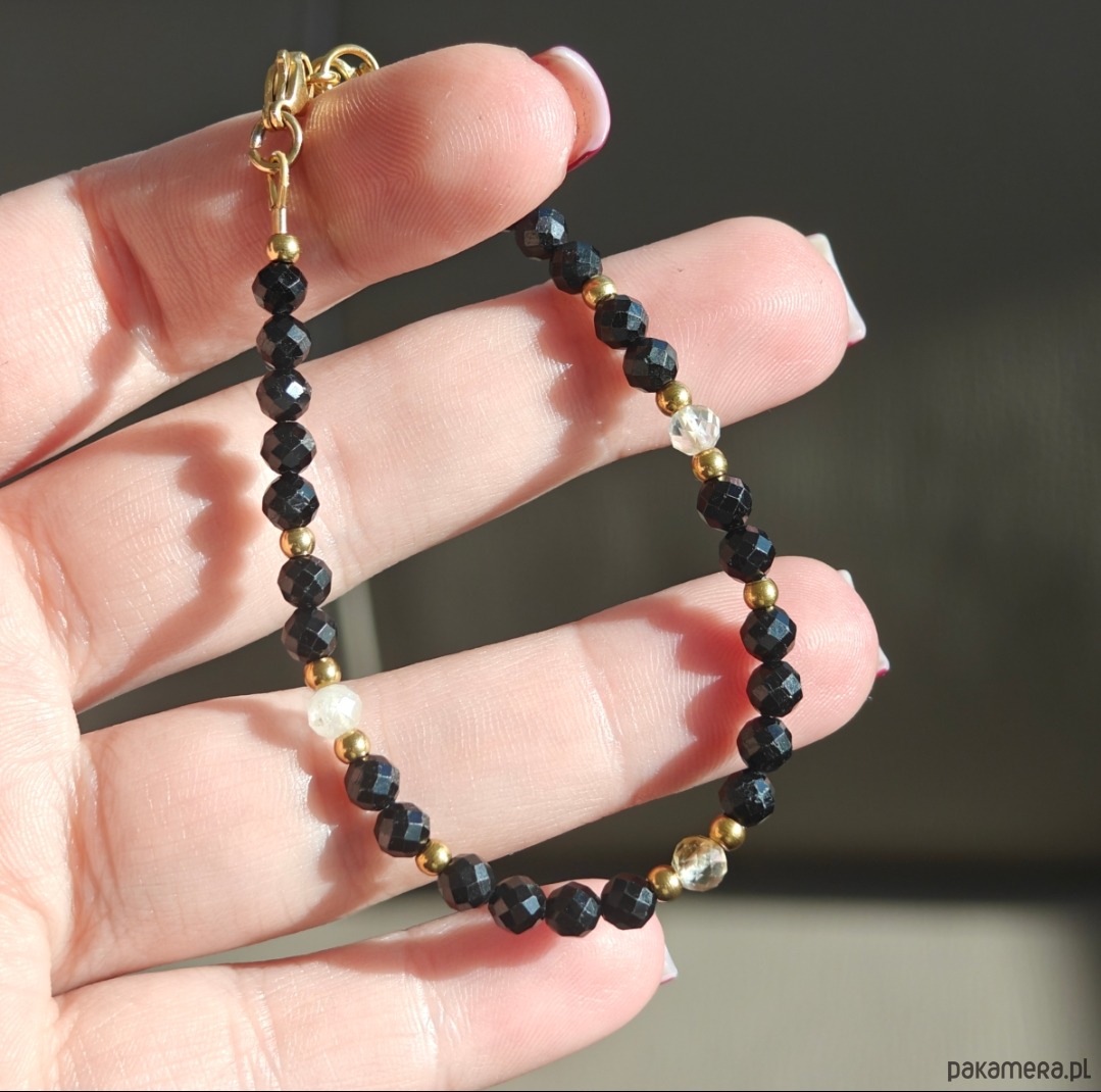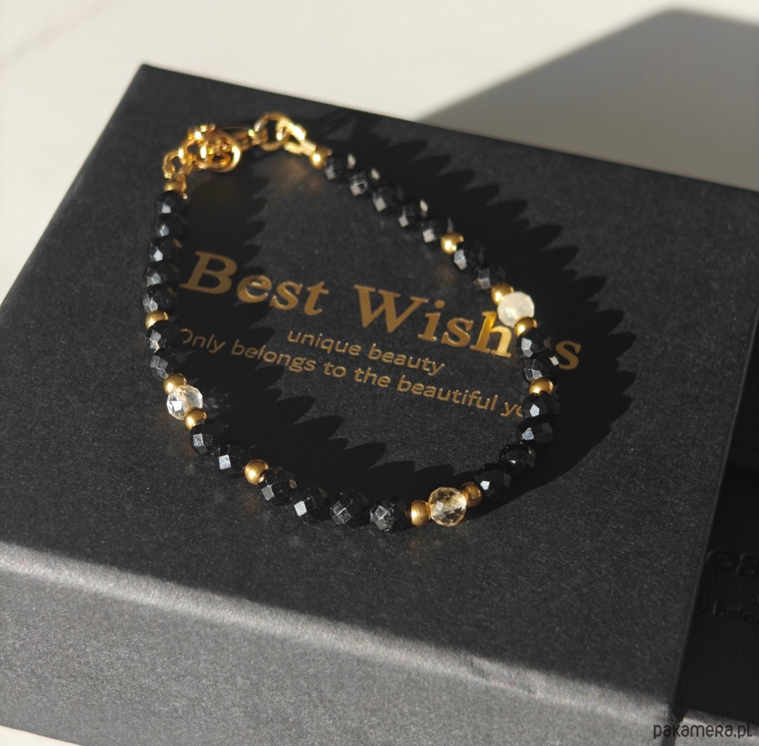 Bransoletka wykonana z połączenia turmalinu i cytrynu, tworzących elegancki kontrast ciemnych i jasnych tonów. Długość bransoletki to 18 cm + 1. 5cm przedłużki, dzięki czemu wygodnie dopasowuje się do nadgarstka. Całość uzupełniają elementy ze stali chirurgicznej oraz drobne akcenty ze srebra pozłacanego, które dodają subtelnego blasku.