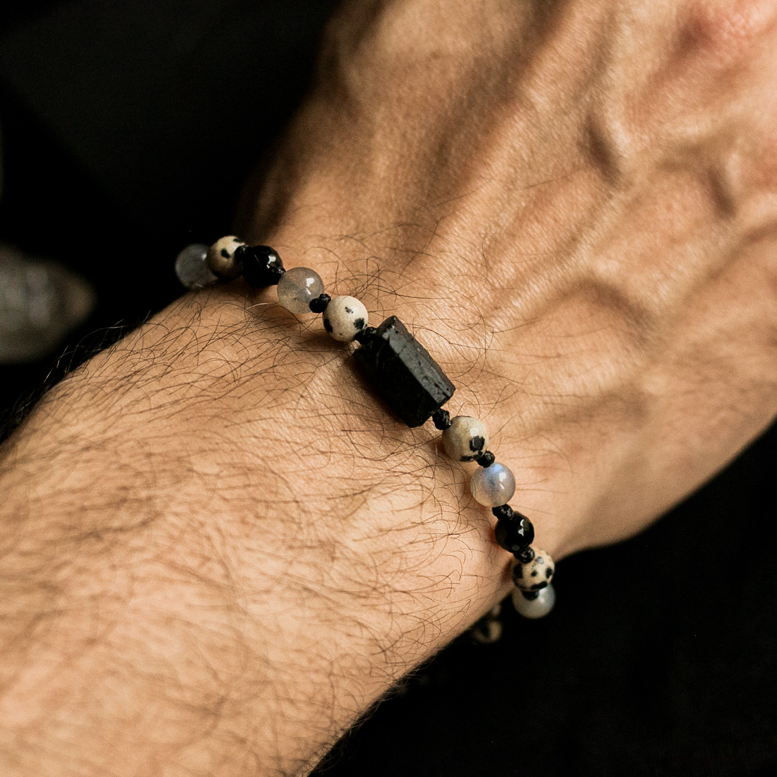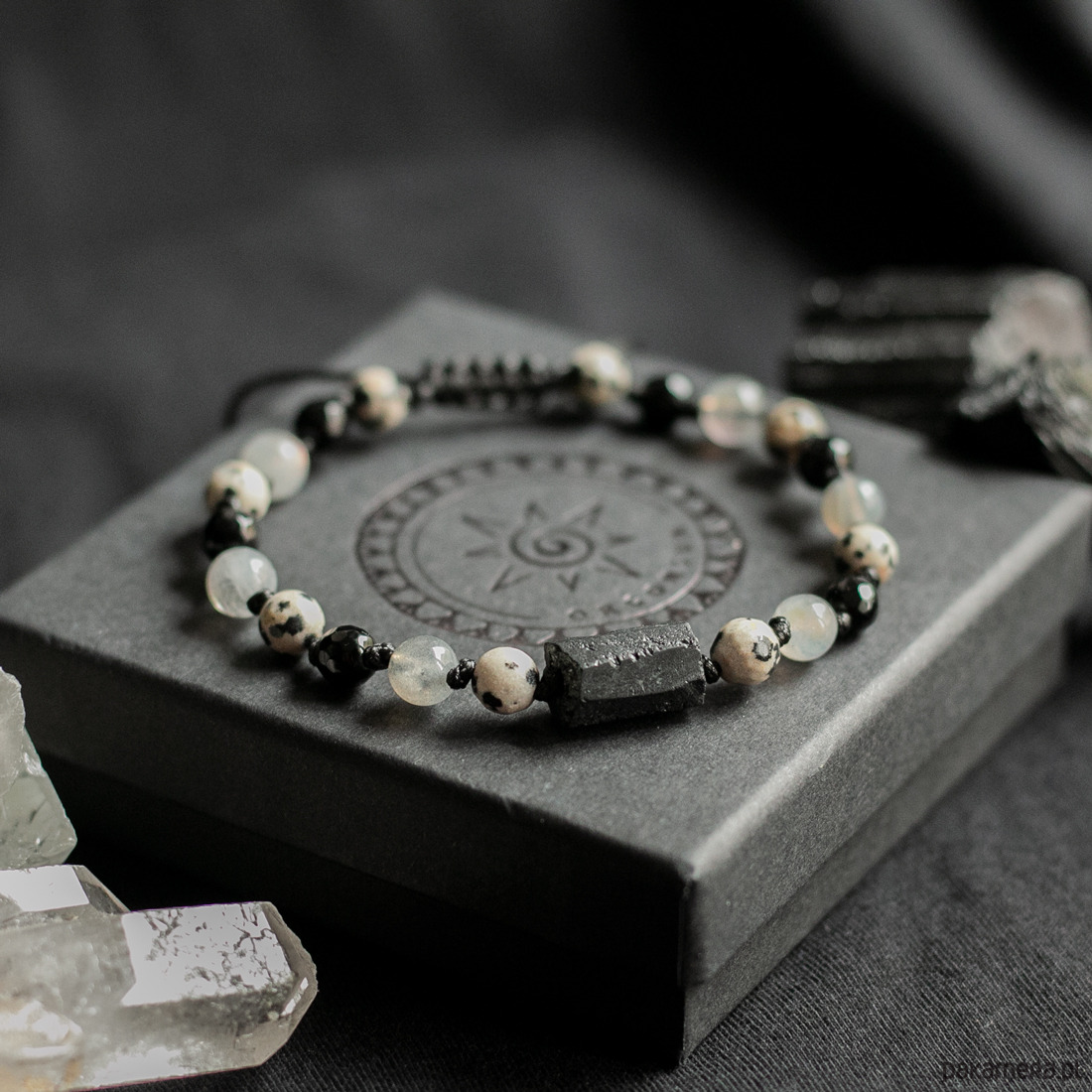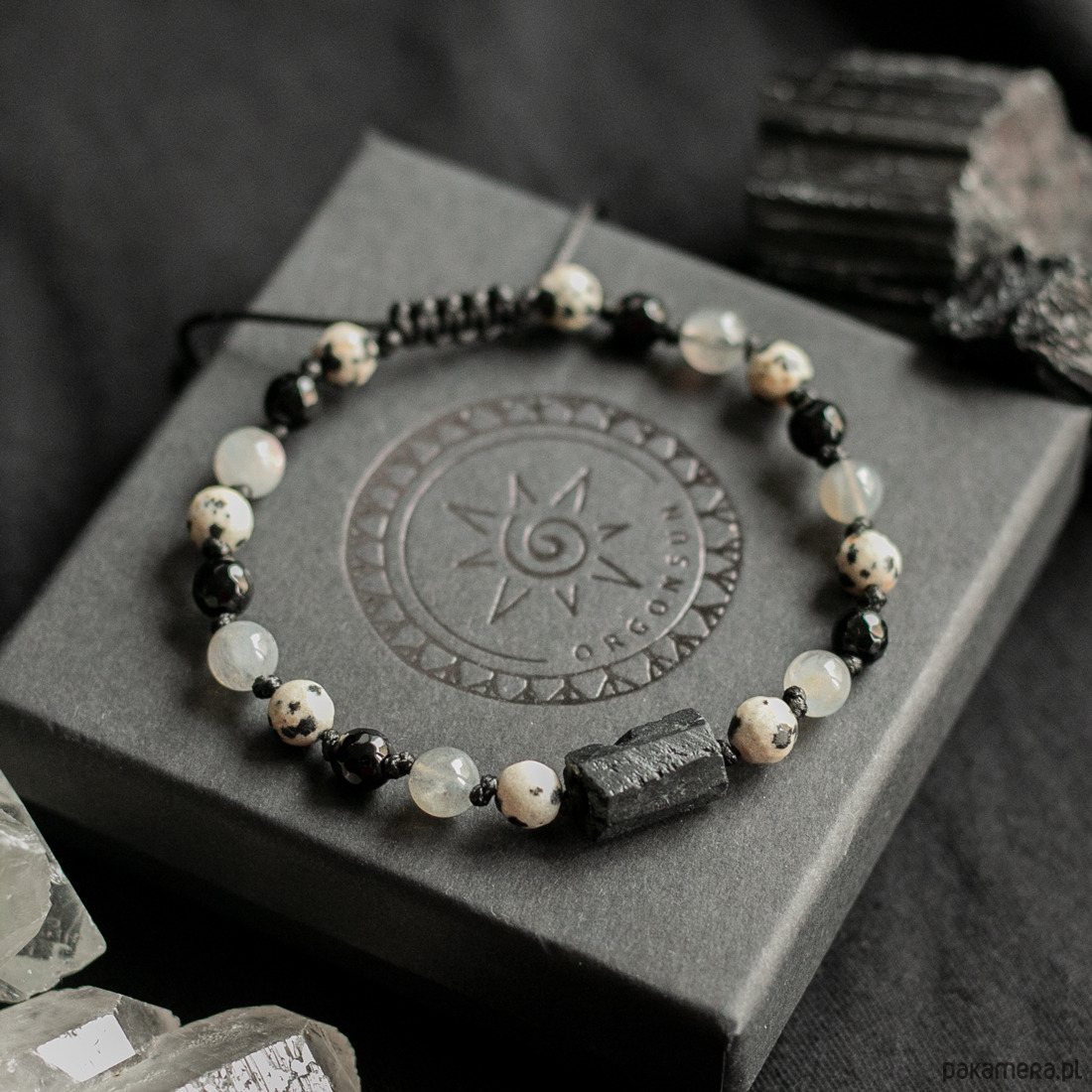 Bransoleta Ochronna z Kamieniami Naturalnymi jest stworzona dla Ciebie jeśli pragniesz otoczyć się energetycznym pierścieniem ochronnym. Zbudowany z potężnych kamieni ochronnych – Turmalin Czarny, Labradoryt, Onyks i Jaspis. Ten talizman działa jak tarcza, odpychając negatywną energię i zapewniając poczucie bezpieczeństwa.