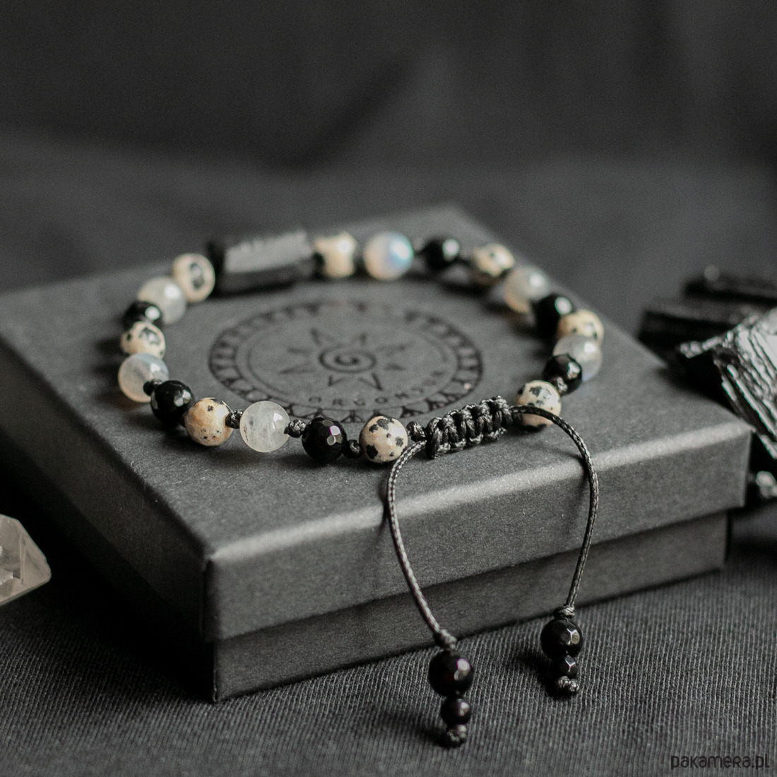 Pakowanie: Bransoletka jest zapakowana w ozdobne pudełko w kolorze czarnym wraz z opisem kamieni.