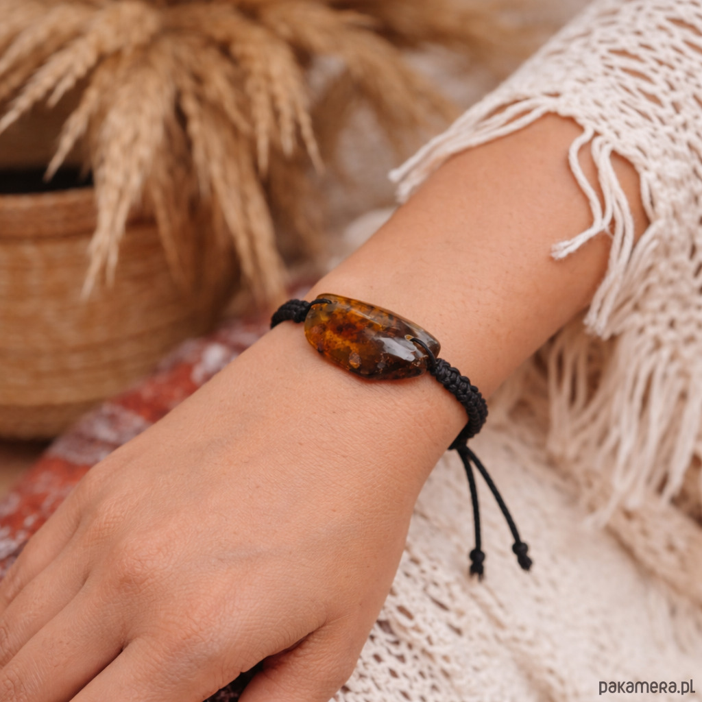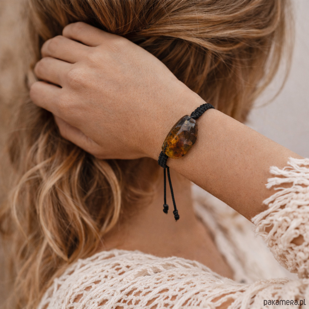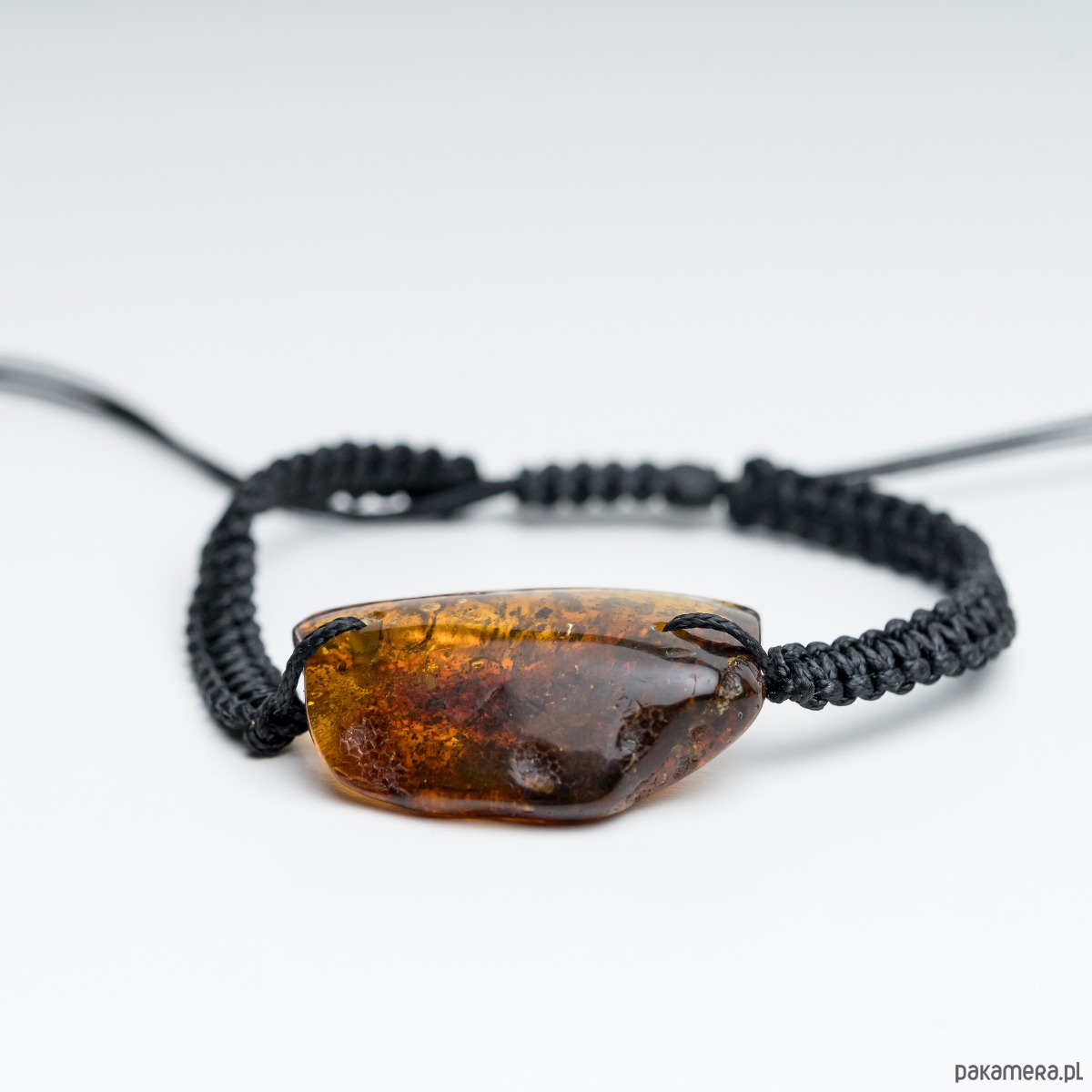 Bransoletka wykonana z naturalnego bursztynu bałtyckiego. Osadzona na wytrzymałym sznurku nylonowym z regulowanym zapięciem typu makrama. Lekka i wygodna w noszeniu, odpowiednia na co dzień.