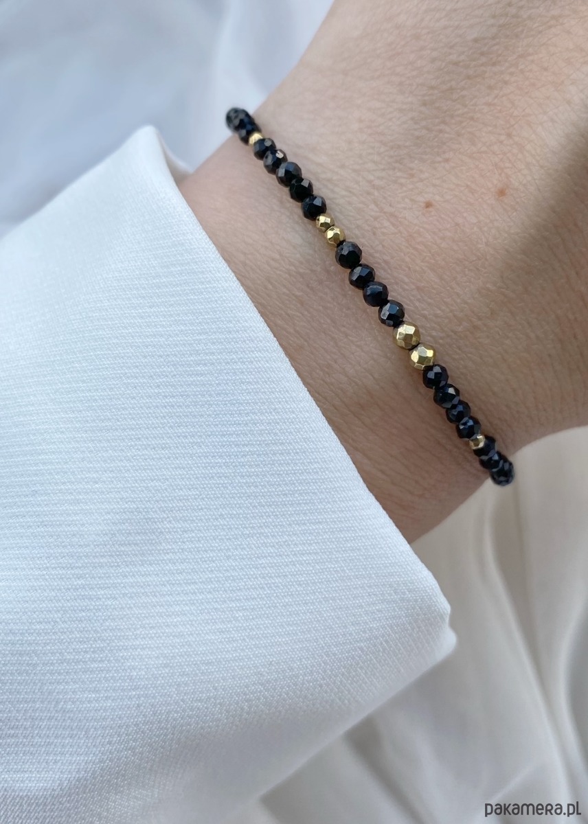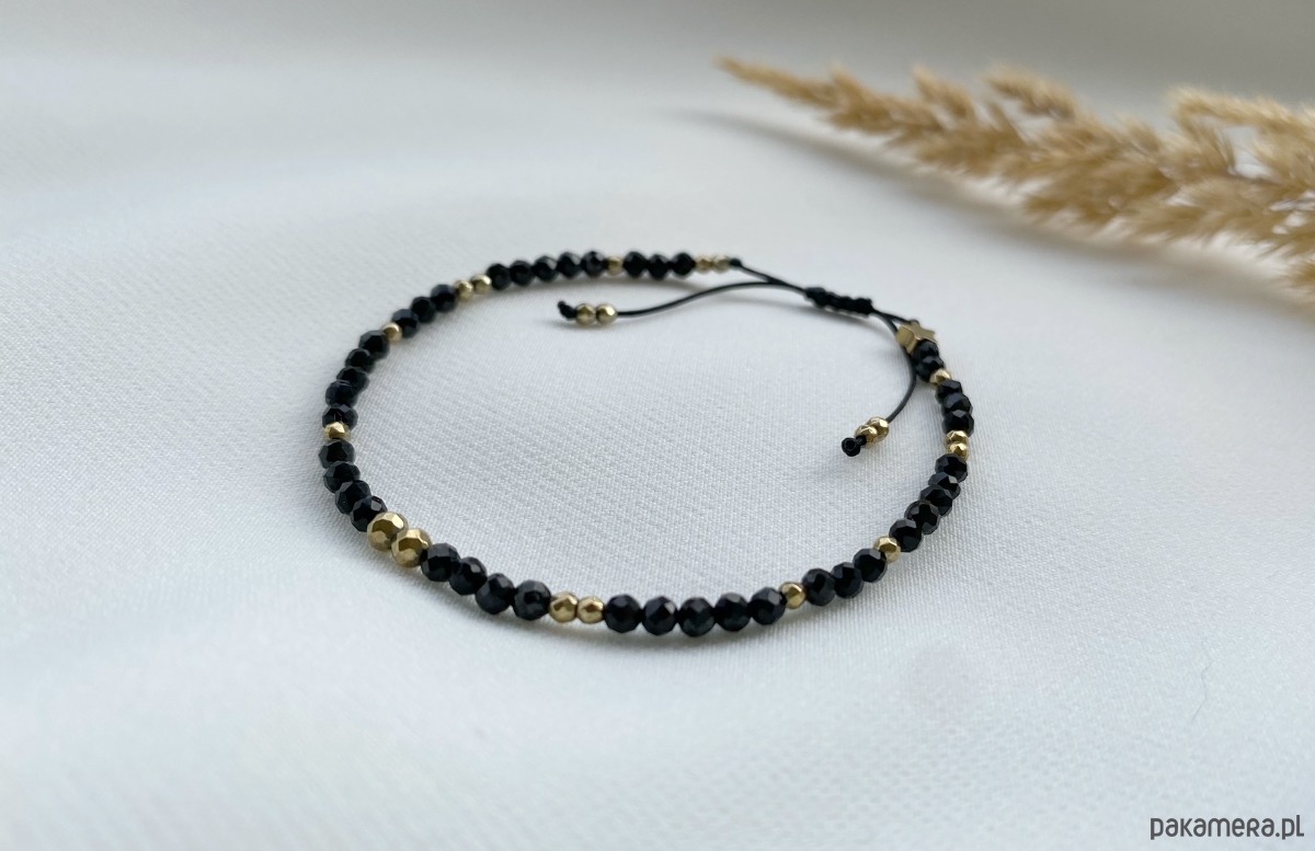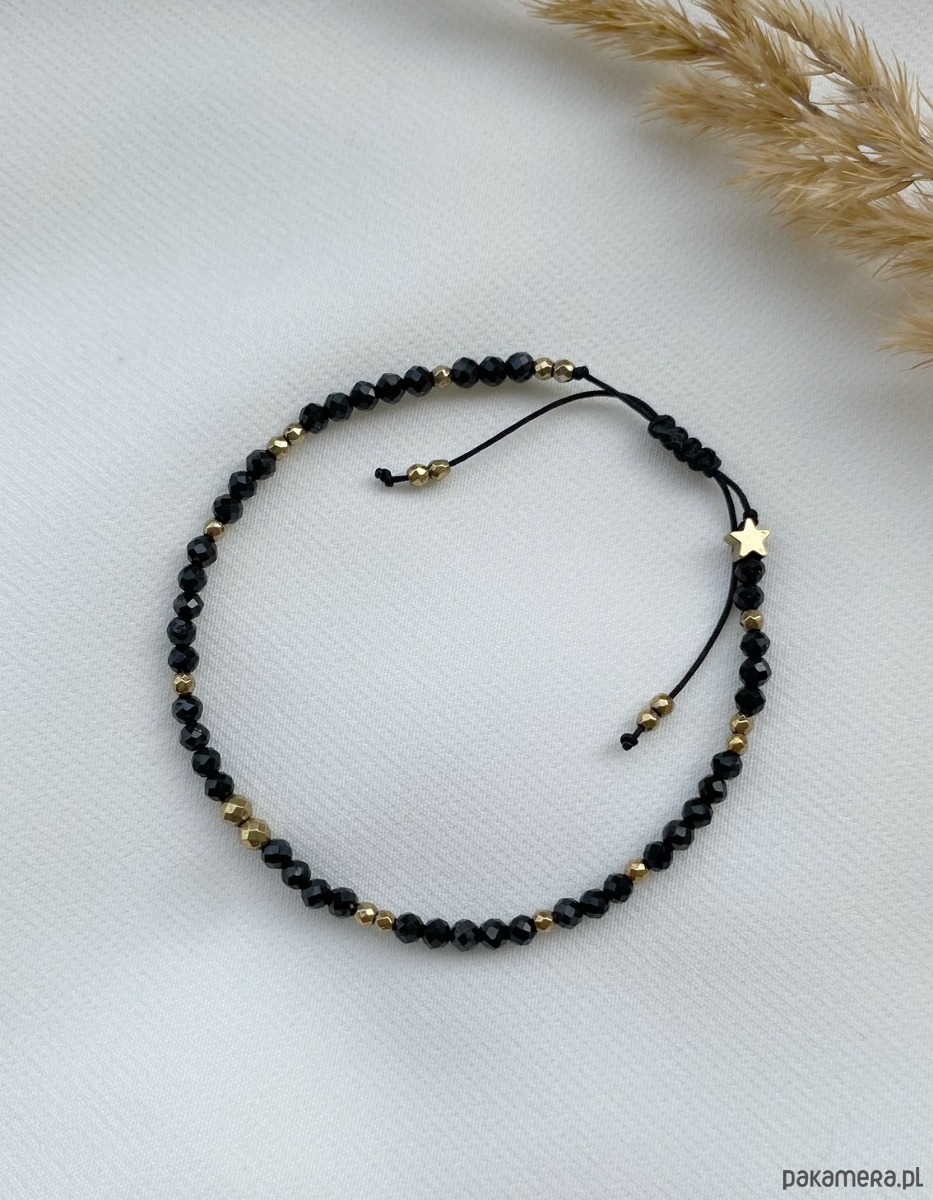 Bransoletka ozdobiona jest hematytami w kolorze złotym oraz hematytową gwiazdeczką.