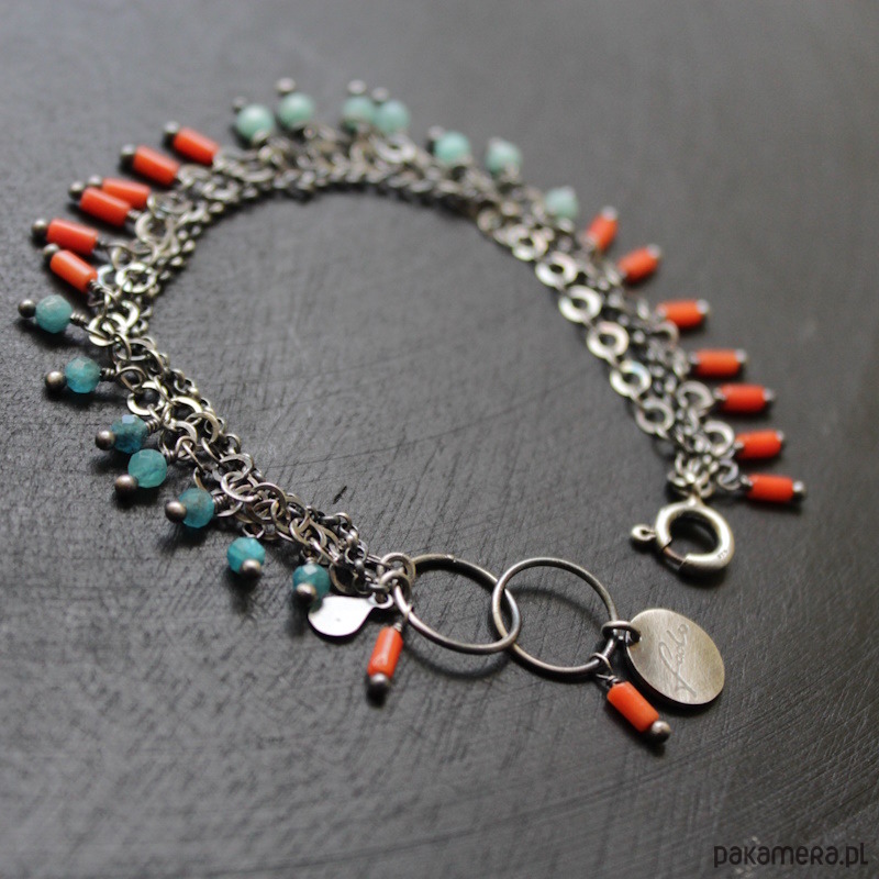 Bransoletka wykonana została z oksydowanego srebra próby 925 oraz kolorowych minerałów.