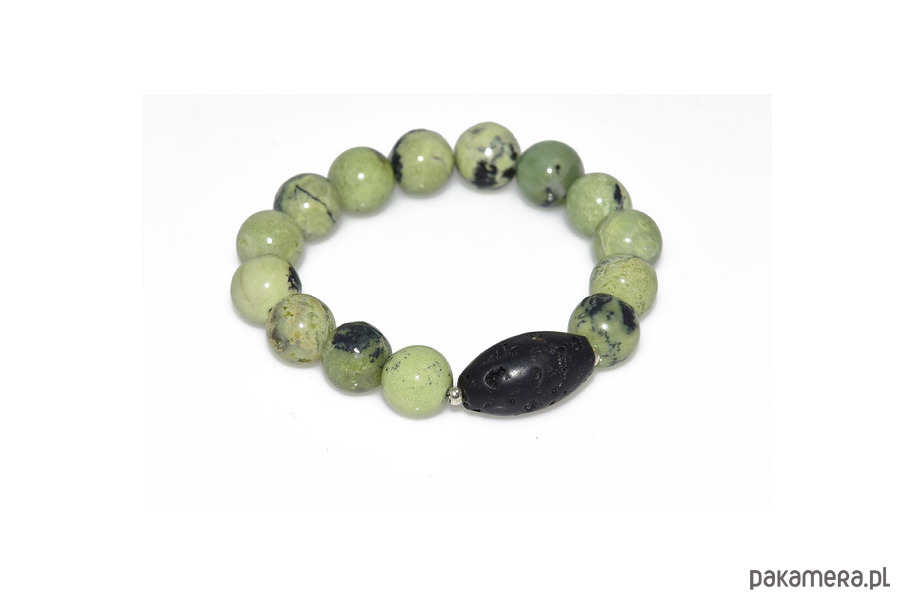 Urocza bransoletka z delikatnych oliwkowo zielonych kul z czarnymi refleksami. Ozdobiona z owalnym kamieniem lawy i połyskującymi kuleczkami idealnie zdobi nadgarstek.
