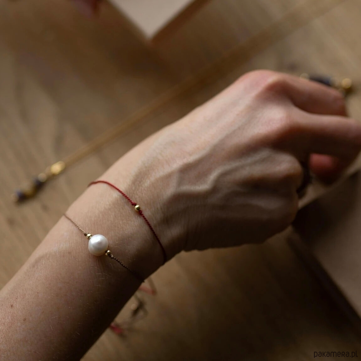 Bransoletka ONLY na beżowym sznureczku, z perłą barokową i kuleczkami pozłacanymi 24 karatowym, żółtym złotem. Niezwykle kobieca, symboliczna, łączy element prostoty i codzienności z elegancką perłą w centrum.