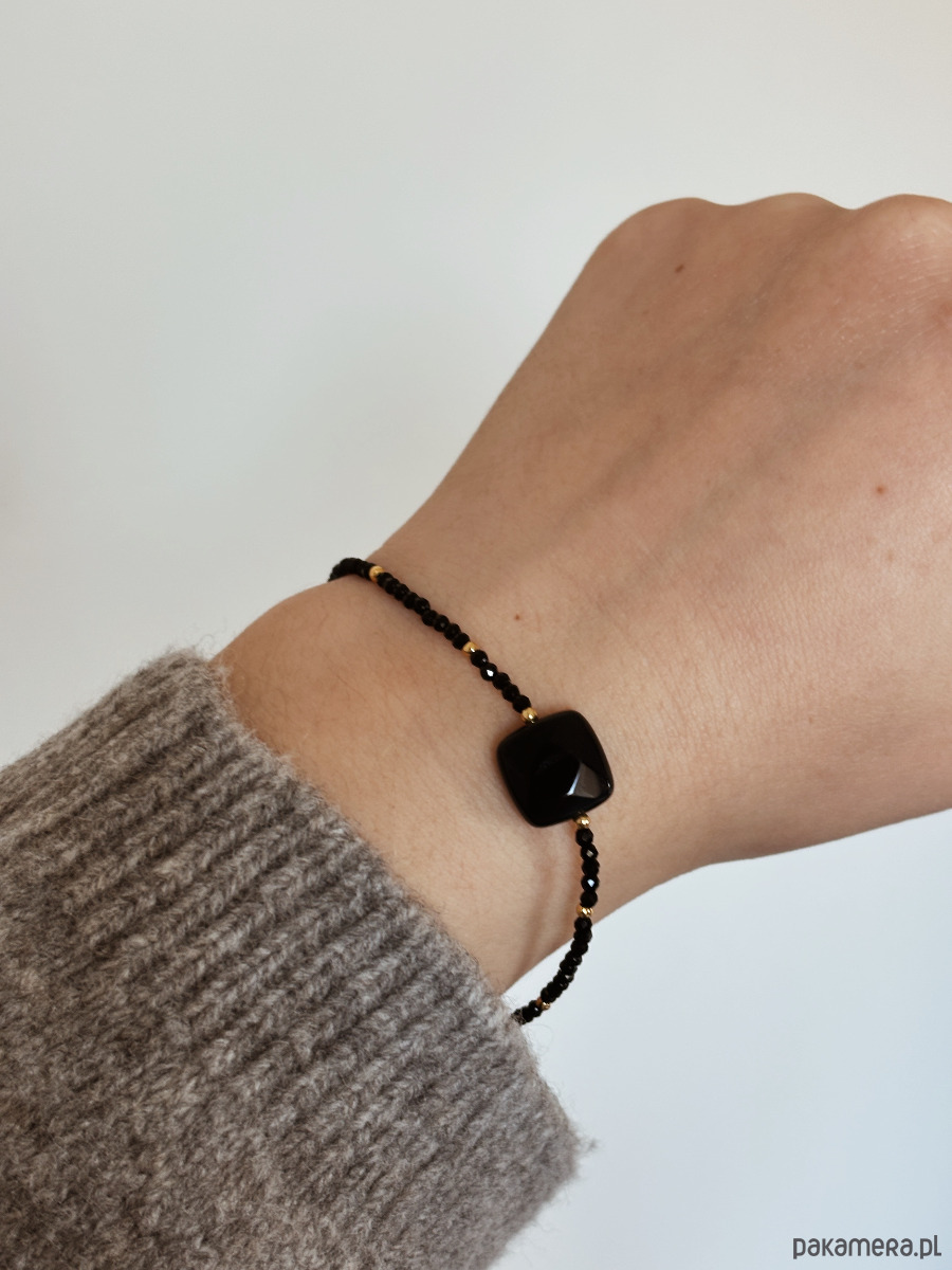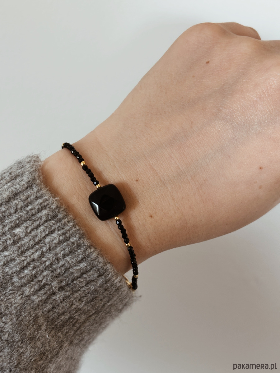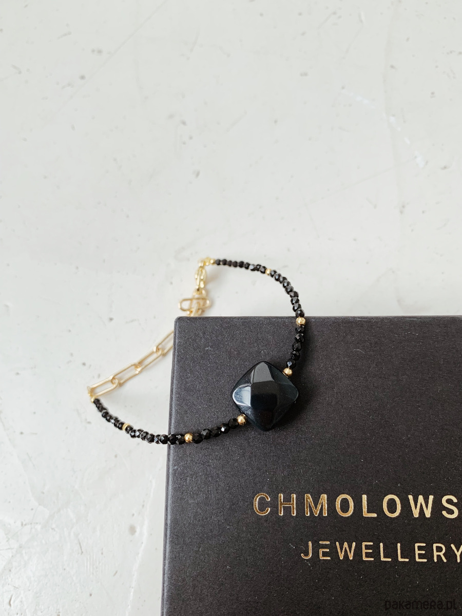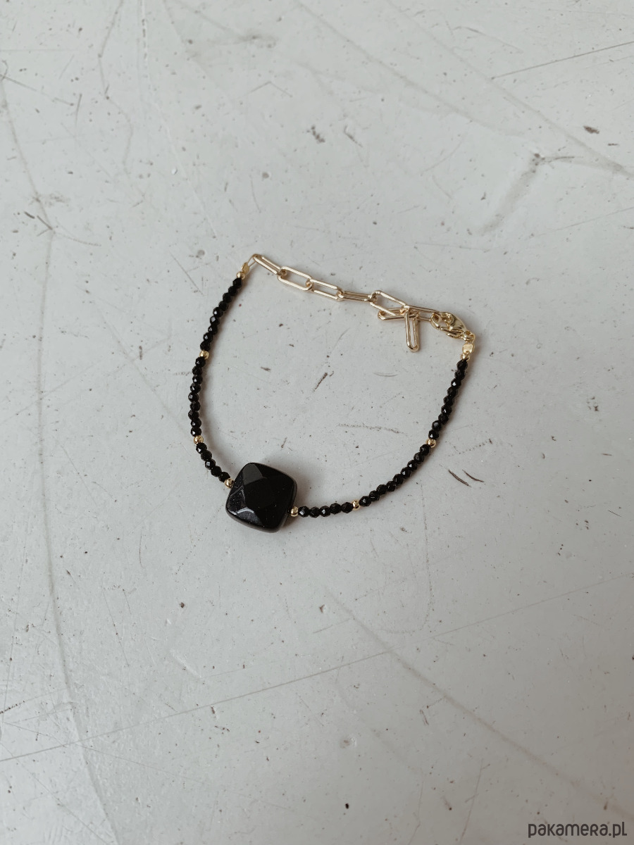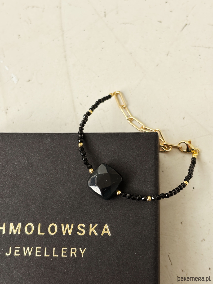 Bransoletka wykonana jest na lince jubilerskiej z użyciem onyksu i agatu czarnego oraz pozłacanych przekładek, zapięcie i łańcuszek rodowane złotem.