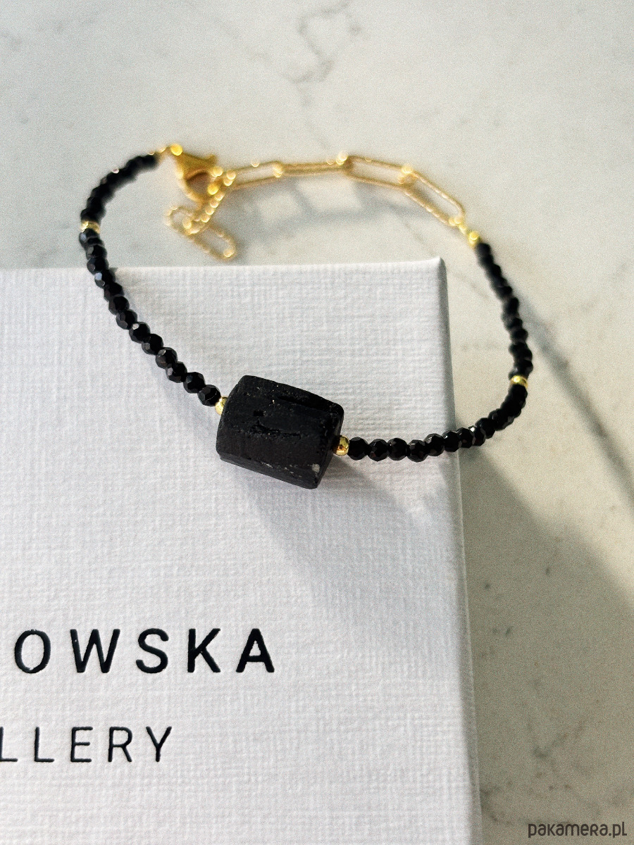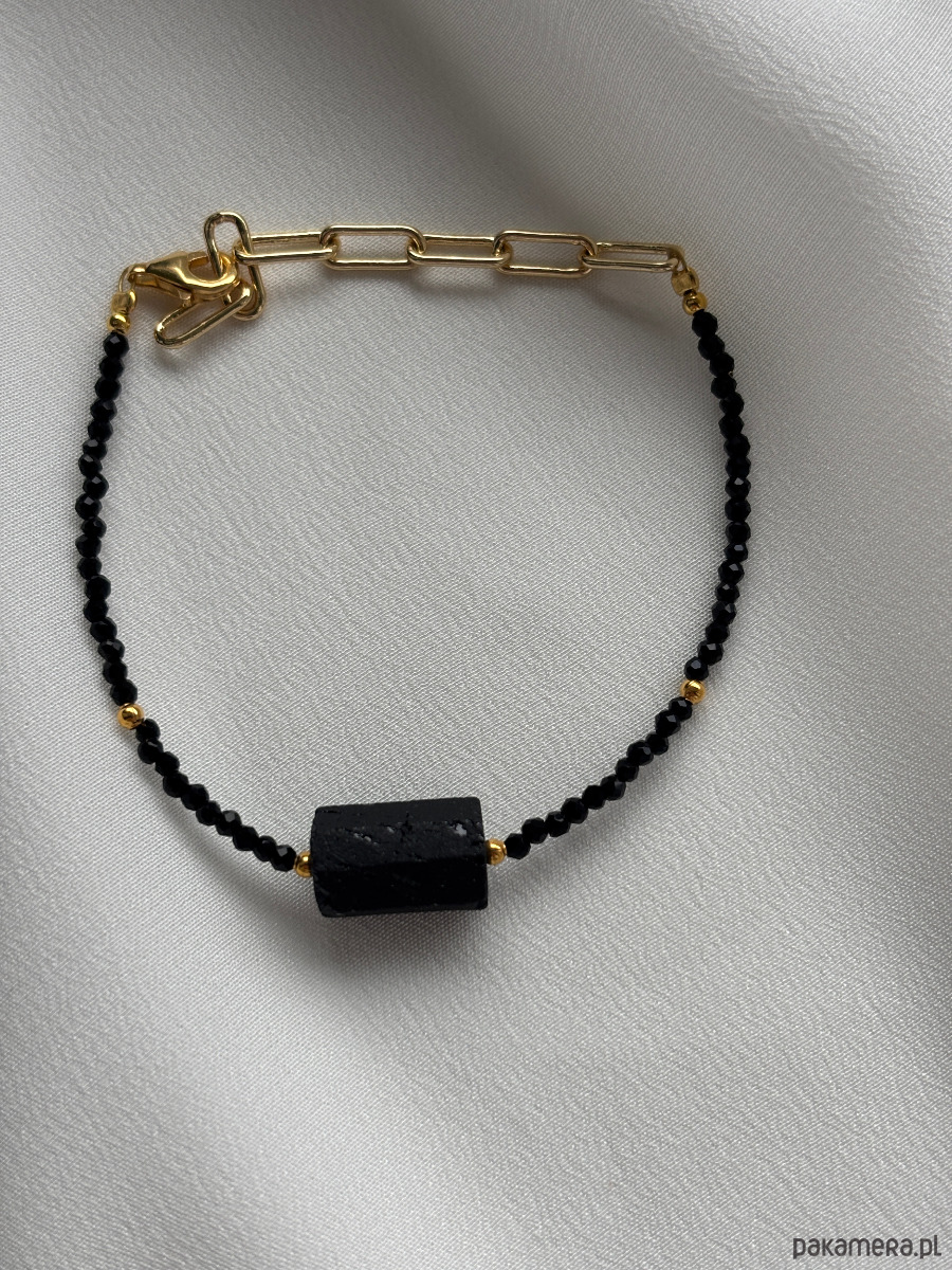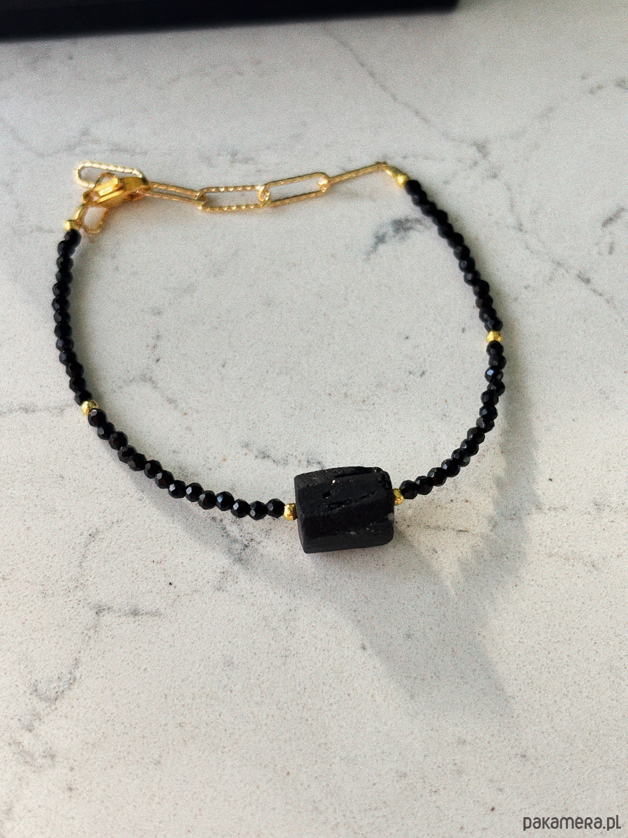 Bransoletka została wykonana na lince jubilerskiej z fasetowanych kamieni onyks oraz surowego turmalinu.