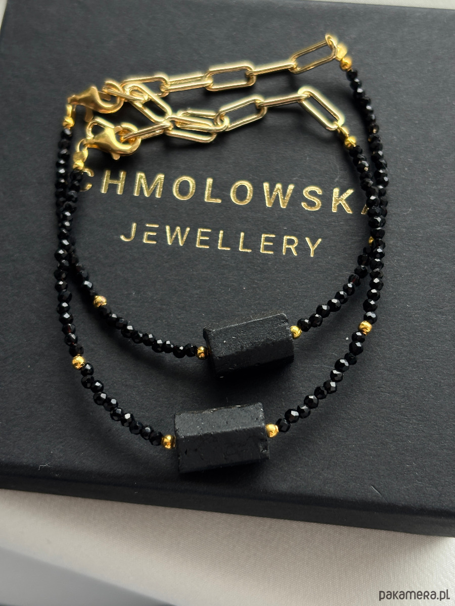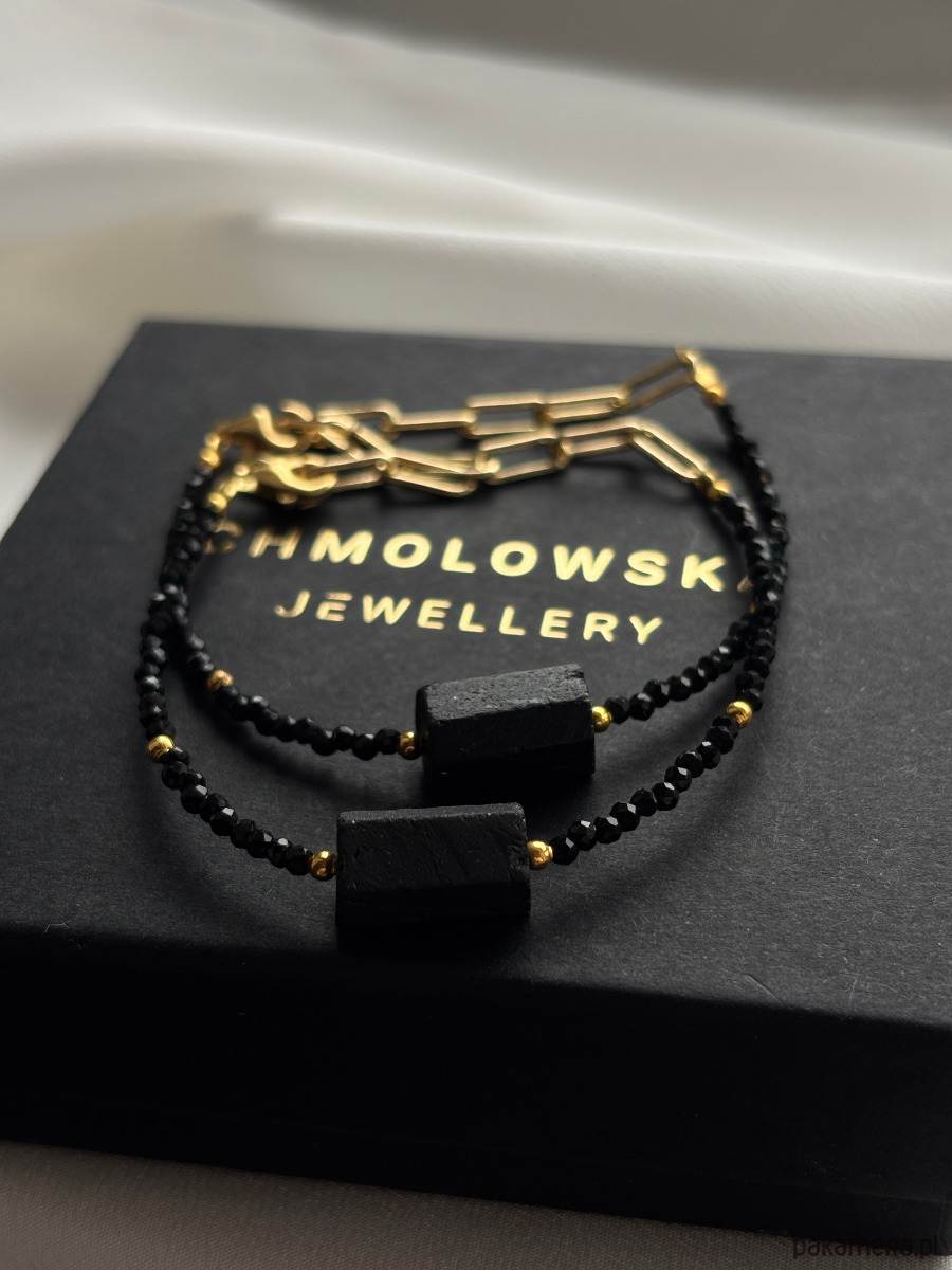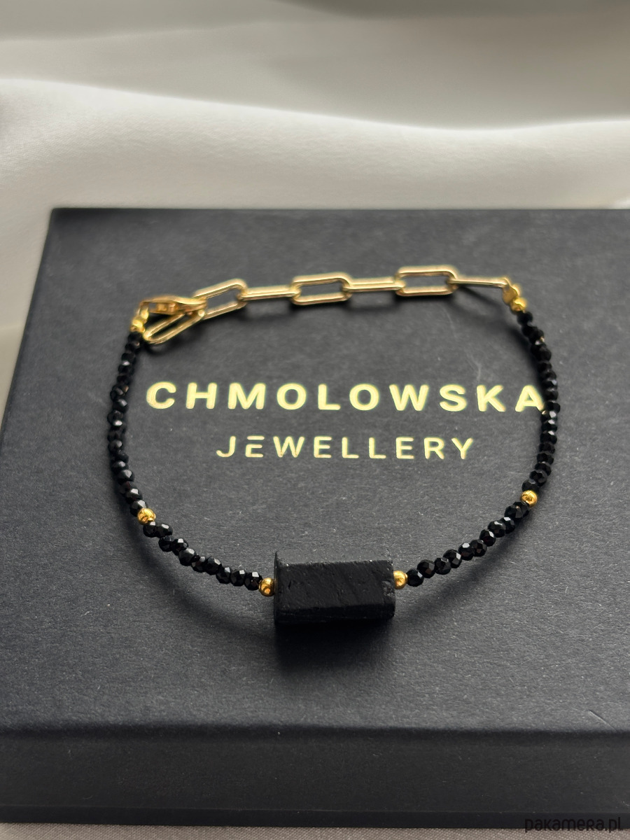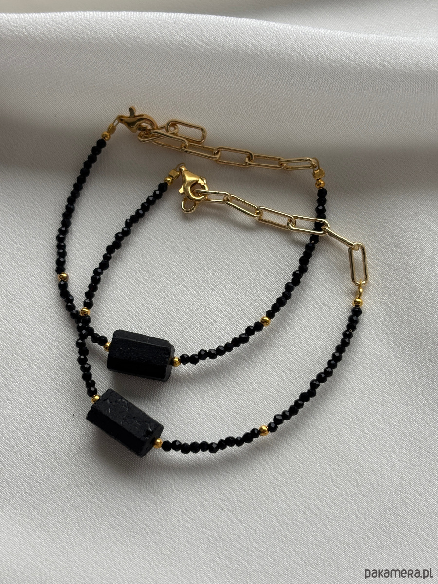 Bransoletka została wykonana na lince jubilerskiej z fasetowanych kamieni onyks oraz surowego turmalinu.