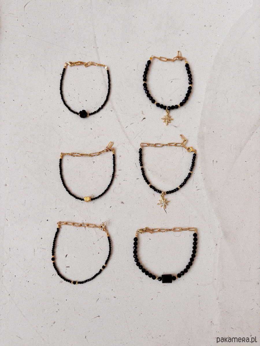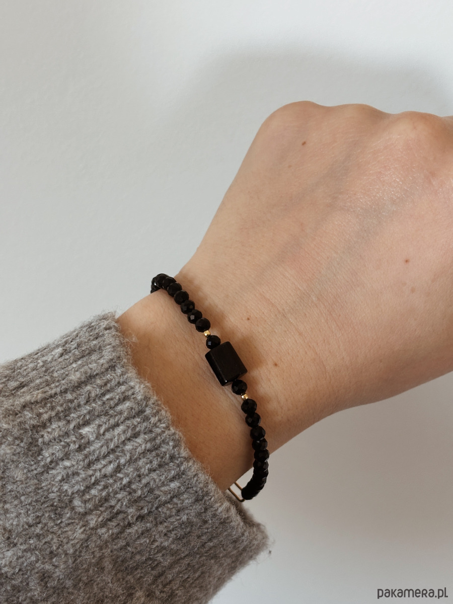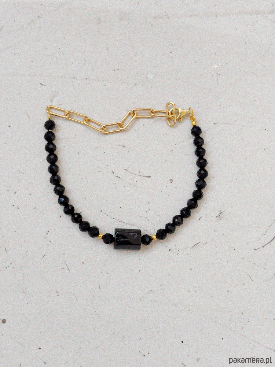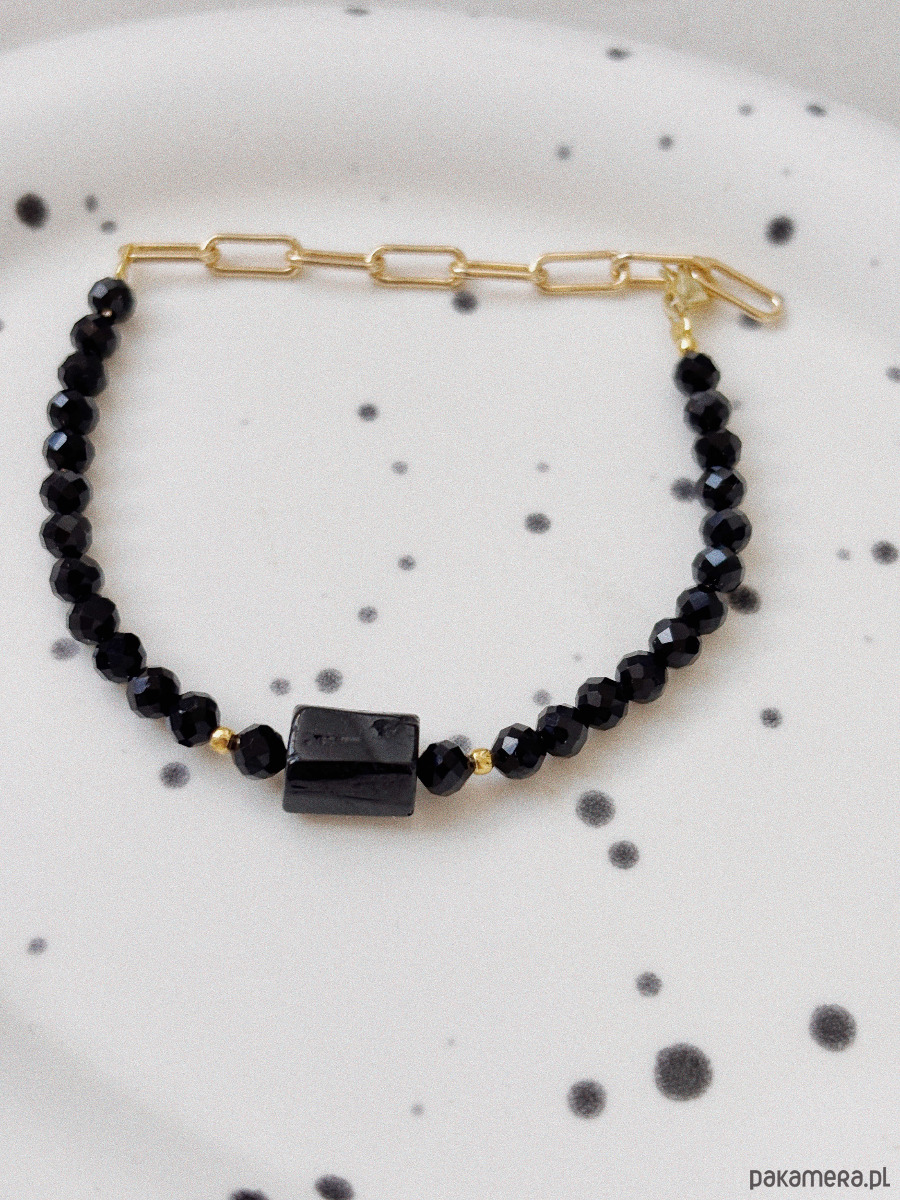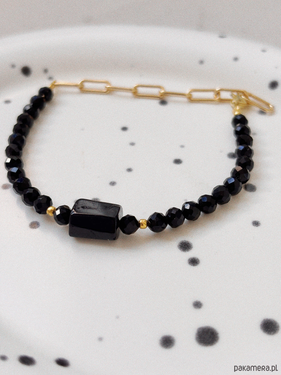 Bransoletka wykonana została na lince jubilerskiej z kamieni onyks i turmalinu, zapięcie i łańcuszek jest ze stali ch.