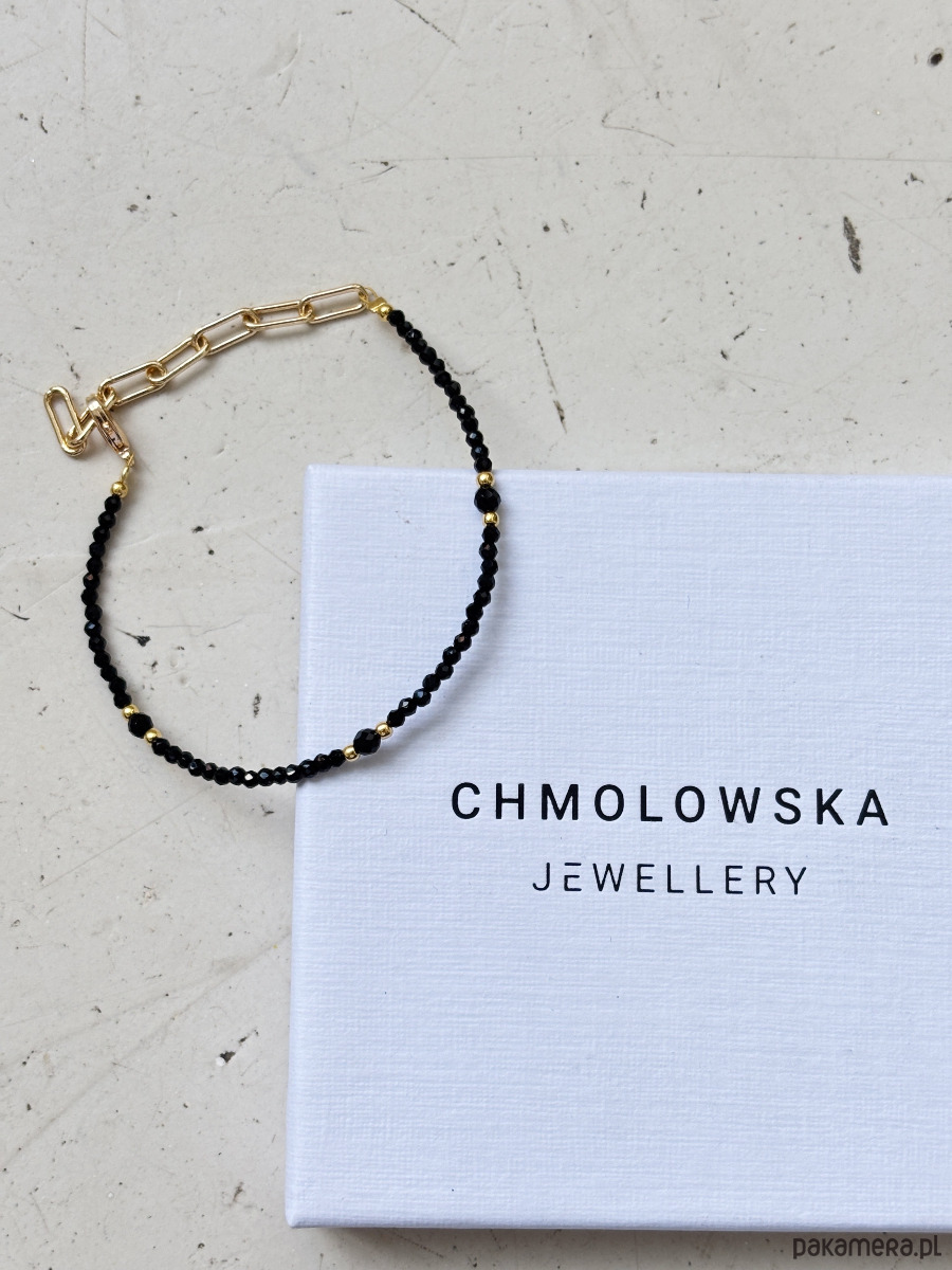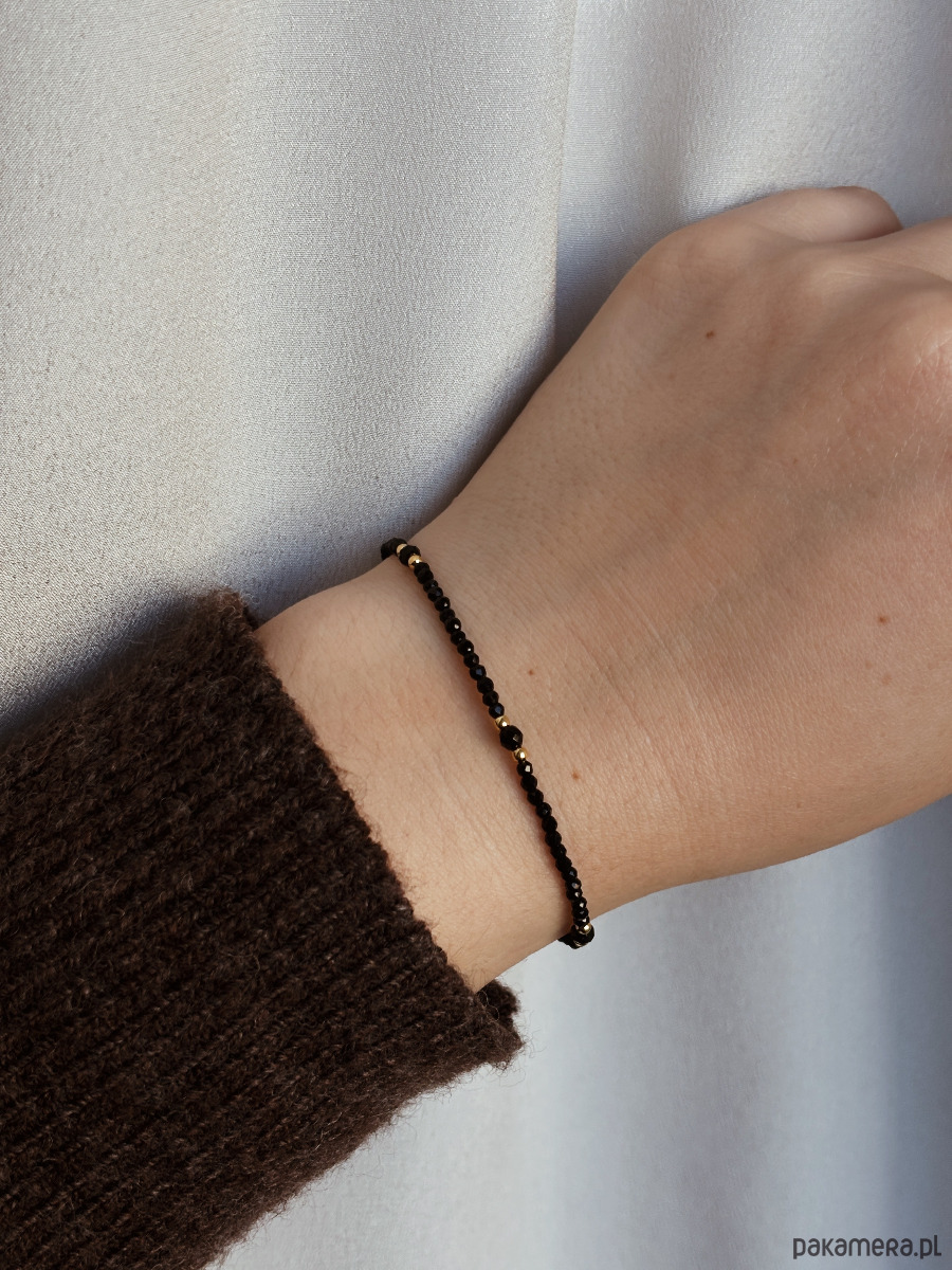Bransoletka wykonana jest na lince jubilerskiej z użyciem onyksu oraz pozłacanych przekładek, zapięcie wykonane ze stali ch.