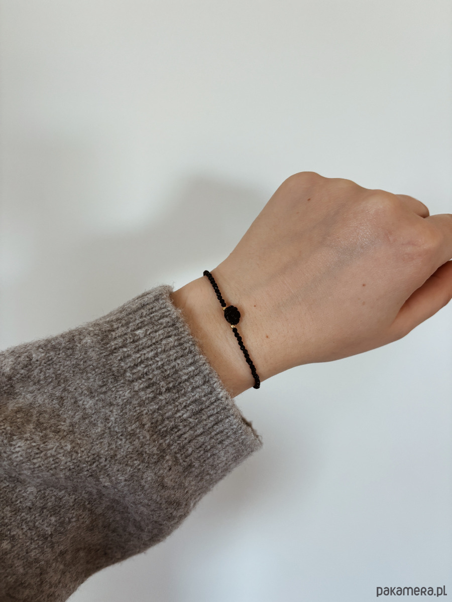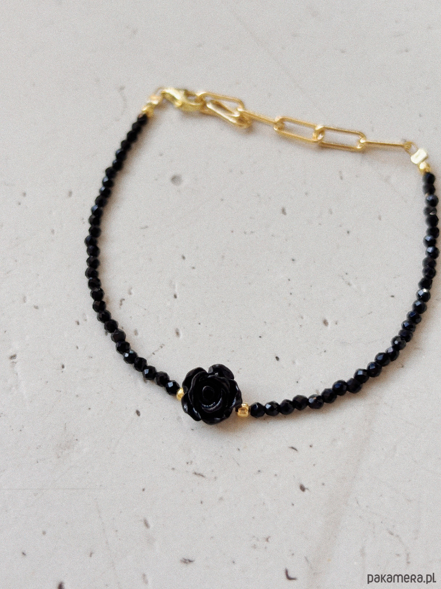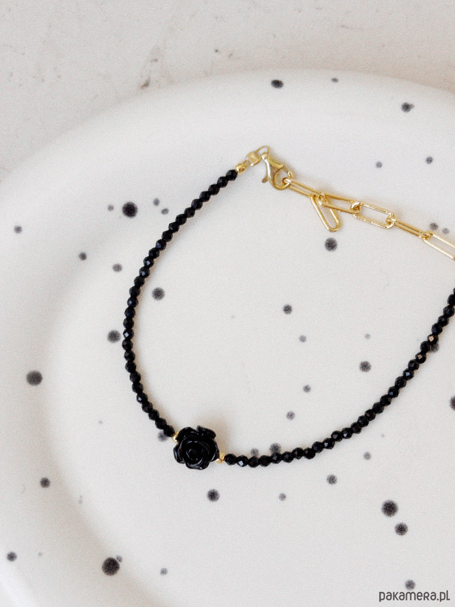 Bransoletka wykonana jest na lince jubilerskiej z użyciem onyksu oraz róży,zapięcie wykonane ze stali ch.