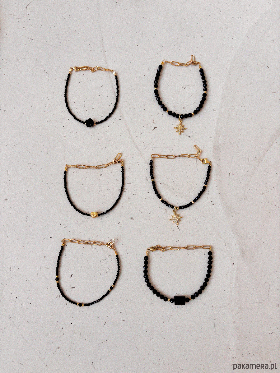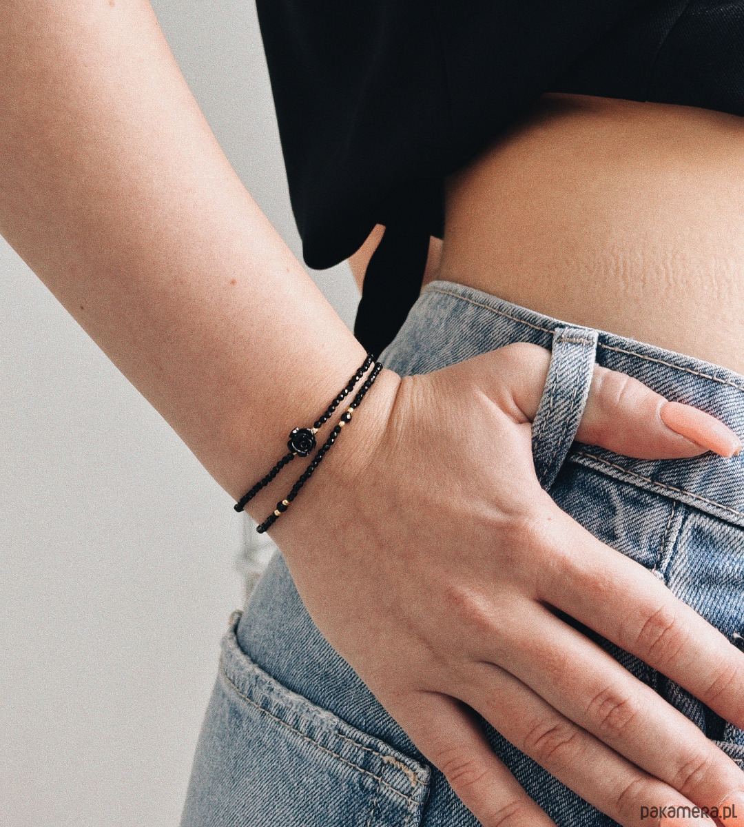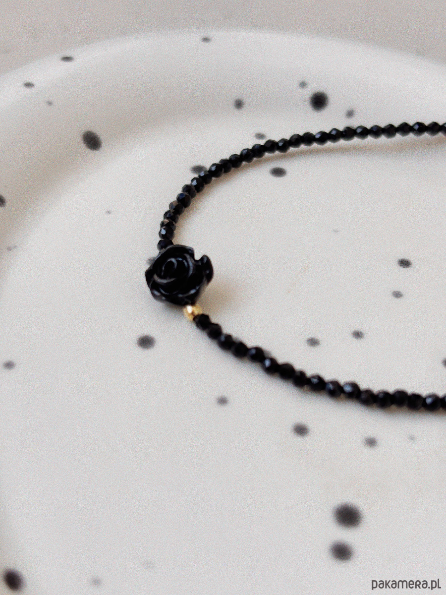 Bransoletka wykonana jest na lince jubilerskiej z użyciem onyksu oraz róży,zapięcie wykonane ze stali ch.