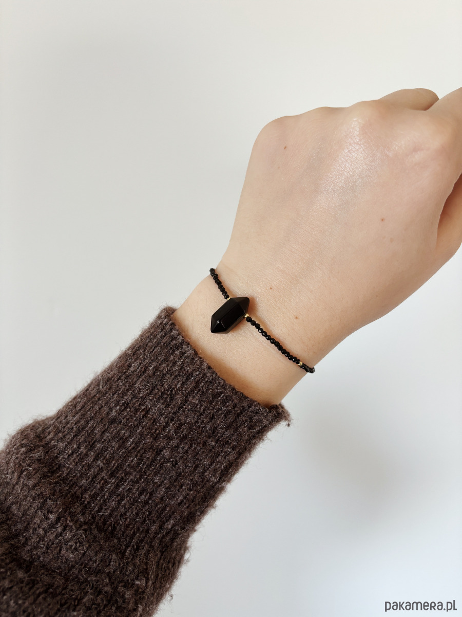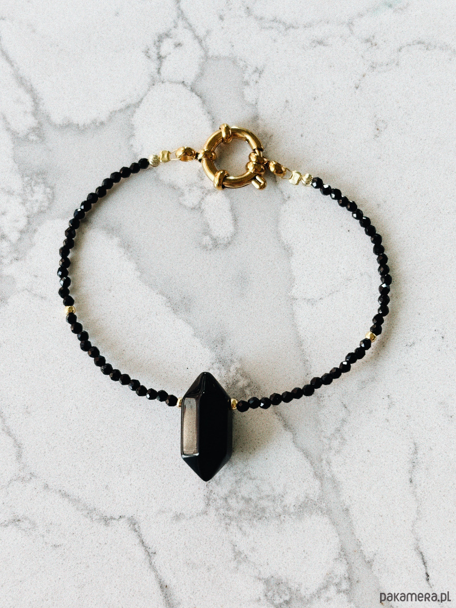 Bransoletka wykonana jest na lince jubilerskiej z użyciem onyksu, zapięcia rodowanego złotem i gortu.