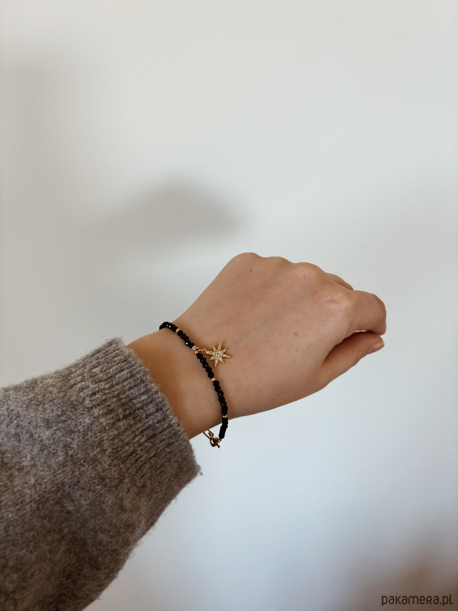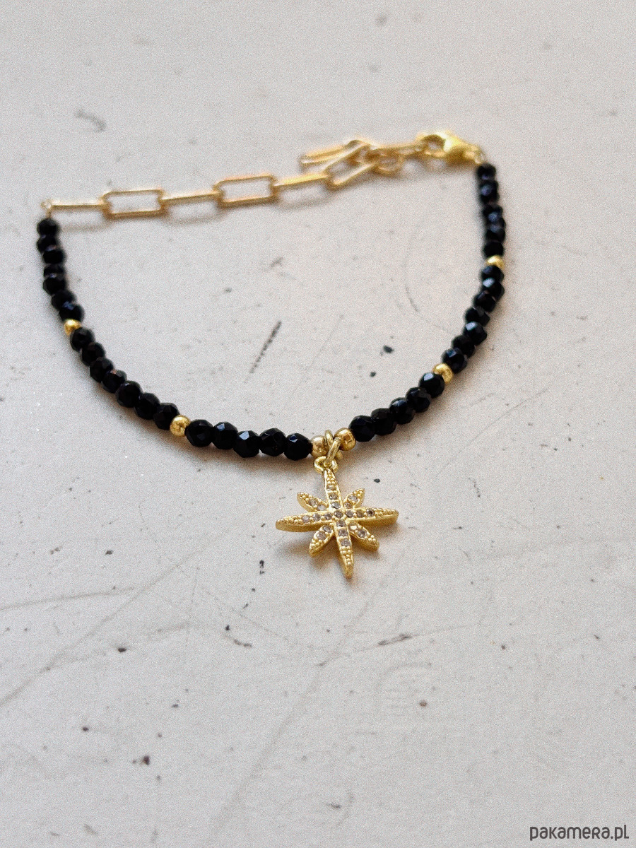 Bransoletka wykonana została na lince jubilerskiej z kamieni onyks i zawieszki w kształcie gwiazdki.