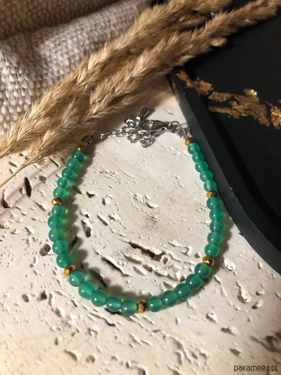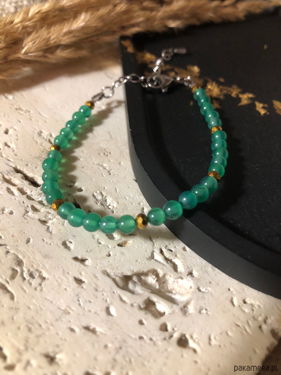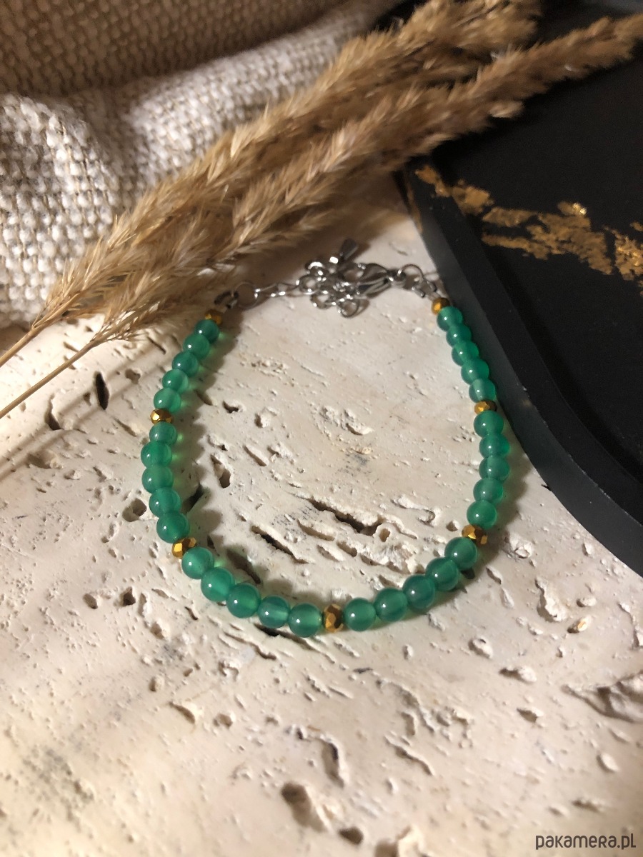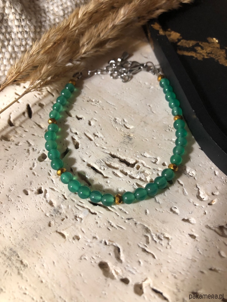 Bransoletka wykonana z naturalnych kamieni. Posiada regulowane zapięcie typu karabińczyk ze stali chirurgicznej. Długość minimalna bransoletki 17 cm, długość maksymalna 22 cm. Na linkę jubilerską nawleczono zielony onyks i szklane kryształki o średnicy 4 mm.
