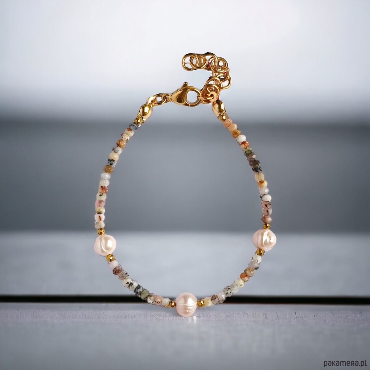 Wykonana z fasetowanych oponek opala peruwiańskiego (3x2mm) w odcieniach delikatnego różu, beżu, brązu , z dodatkiem złotego hematytu oraz pereł słodkowodnych w delikatnym odcieniu różu.