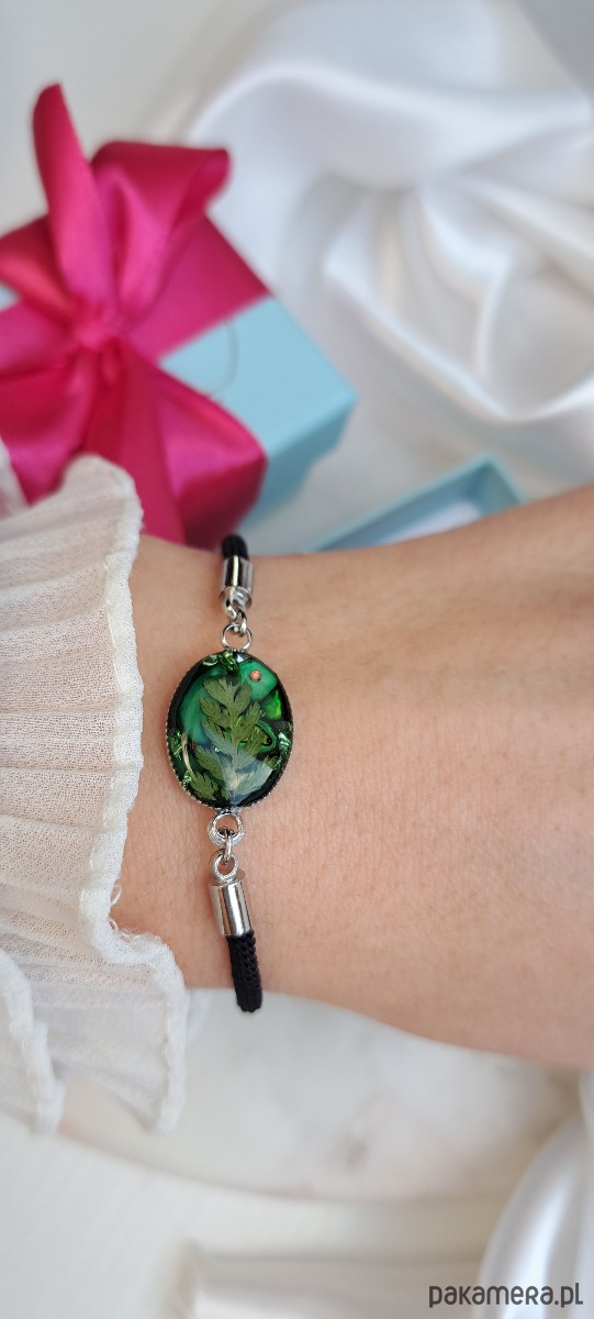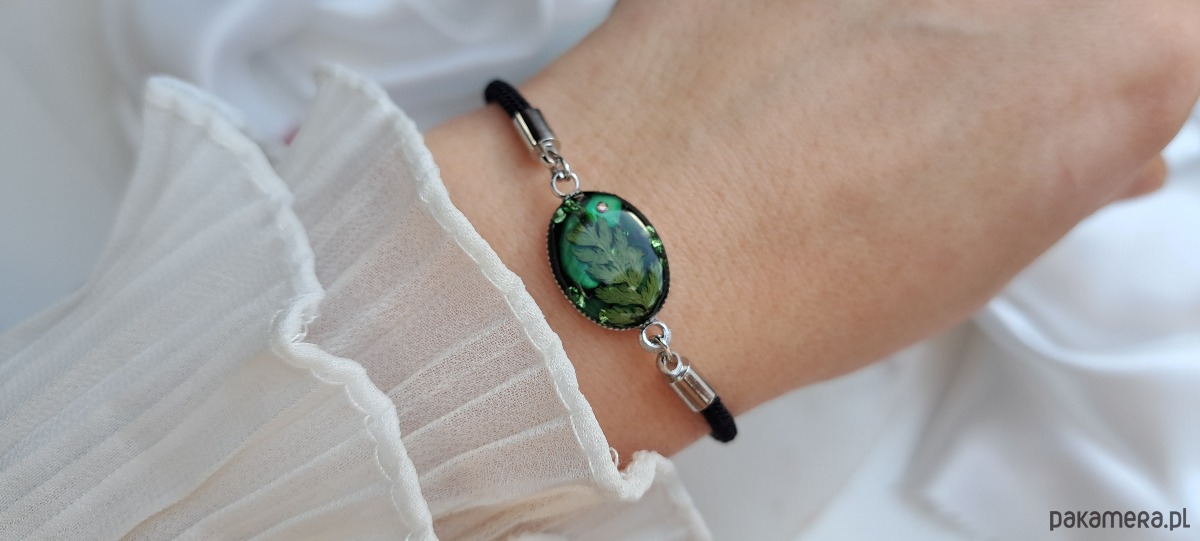 Bransoletka z owalną zawieszką, kwiatami paproci na tle z zielonych muszli