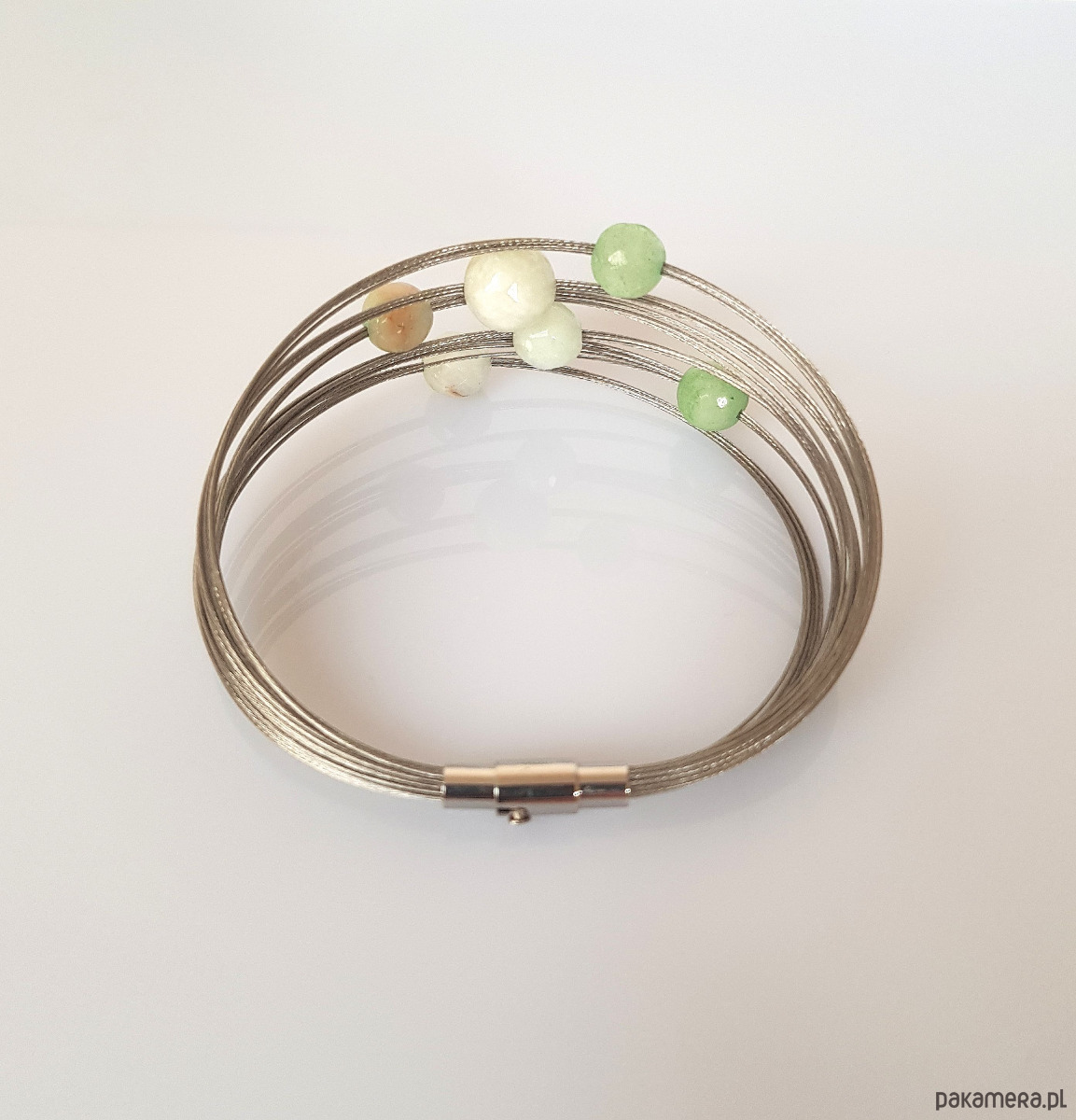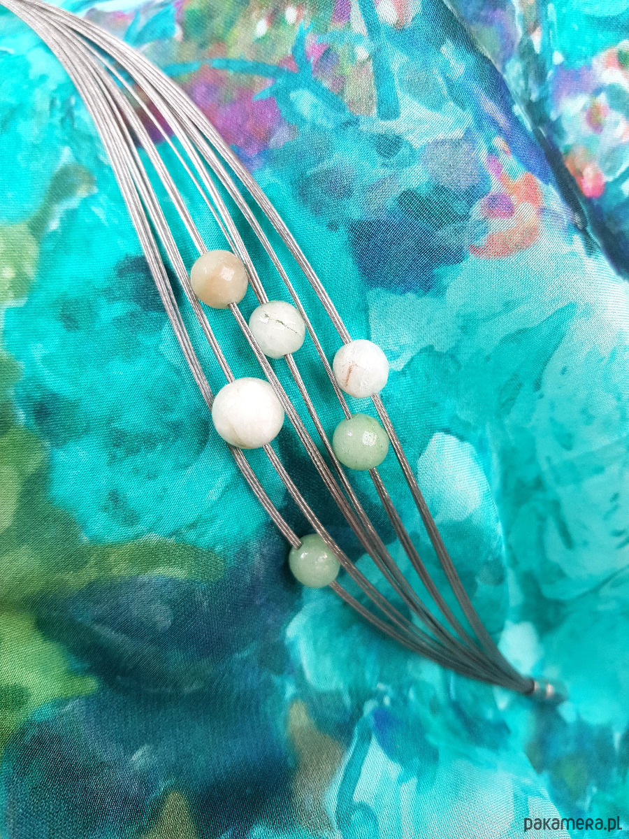 Fasetowane jadeity amazonitowe zaplecione ruchomo na lince jubilerskiej.