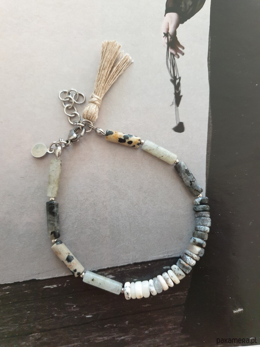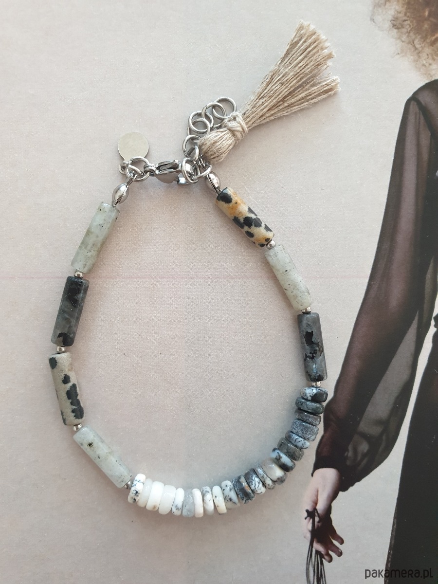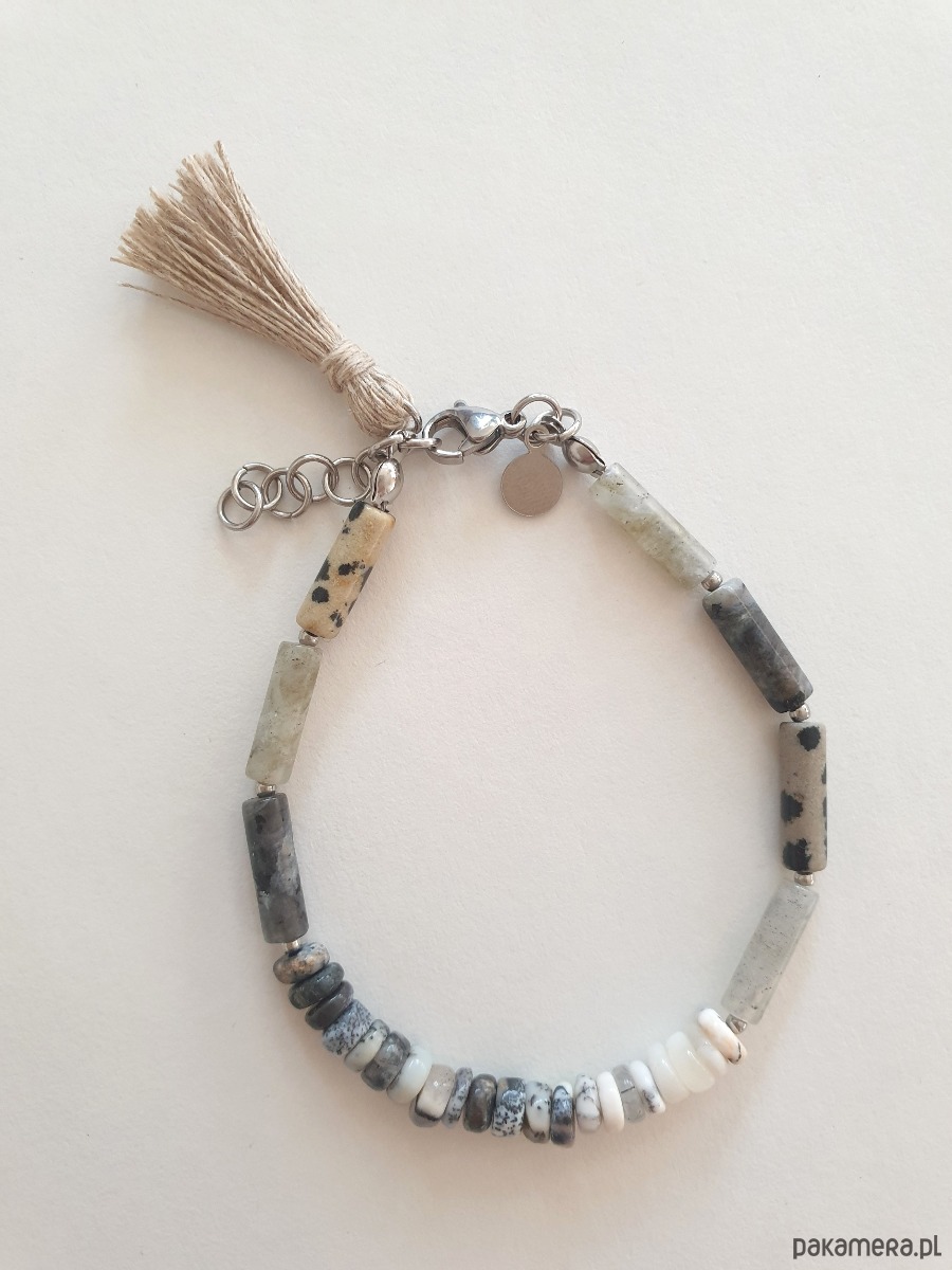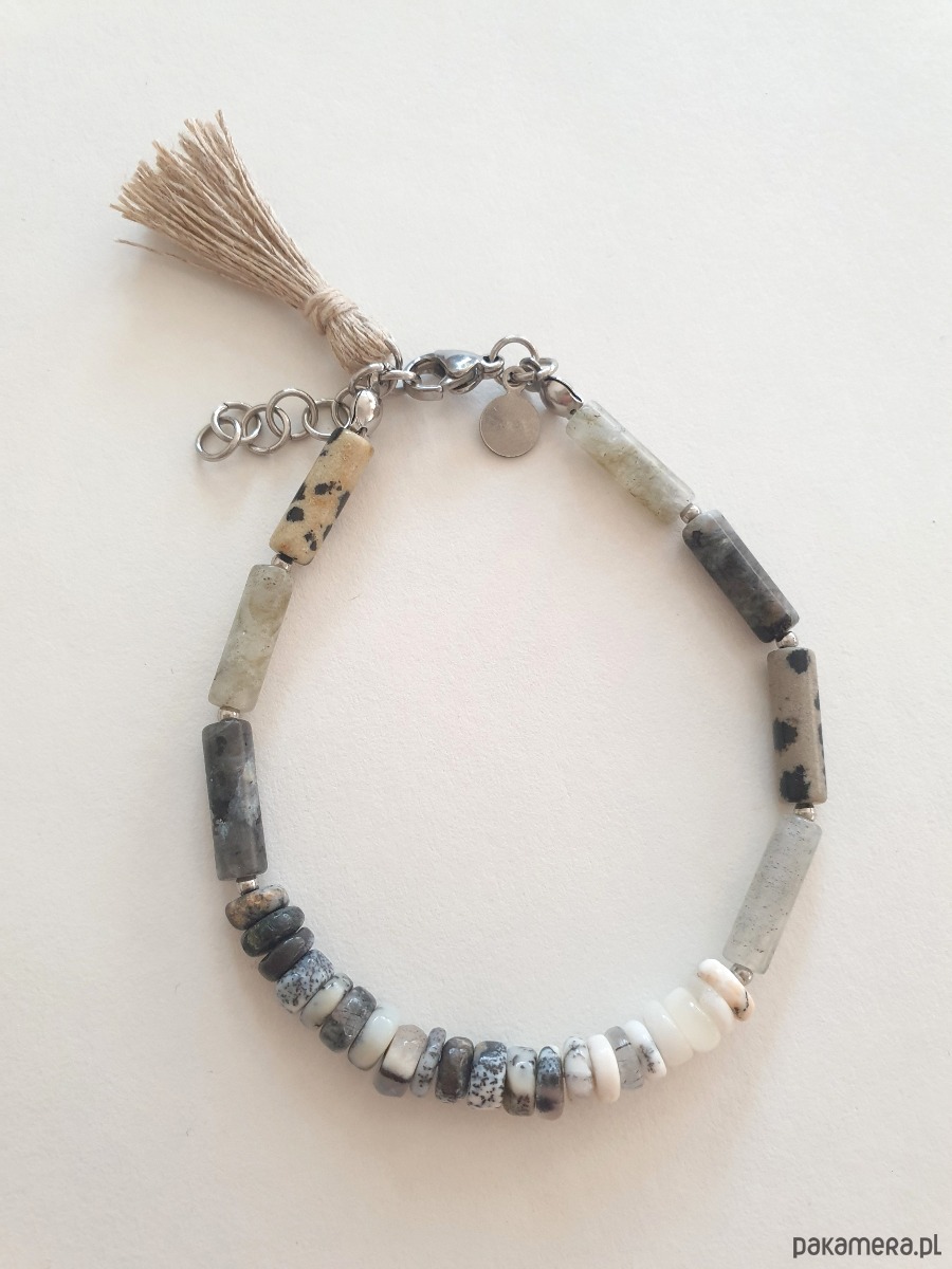 Minimalistyczna bransoletka tworzona ręcznie z kamieni naturalnych, elementów ze stali szlachetnej (antyalergicznej) i lnianego chwosta. W tej - patyczki jaspis dalmatyński, larvikit, labradoryt, opal dendrytowy.