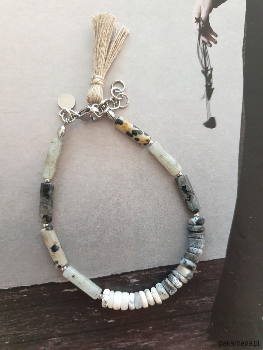 Minimalistyczna bransoletka tworzona ręcznie z kamieni naturalnych, elementów ze stali szlachetnej (antyalergicznej) i lnianego chwosta. W tej - patyczki jaspis dalmatyński, larvikit, labradoryt, opal dendrytowy.