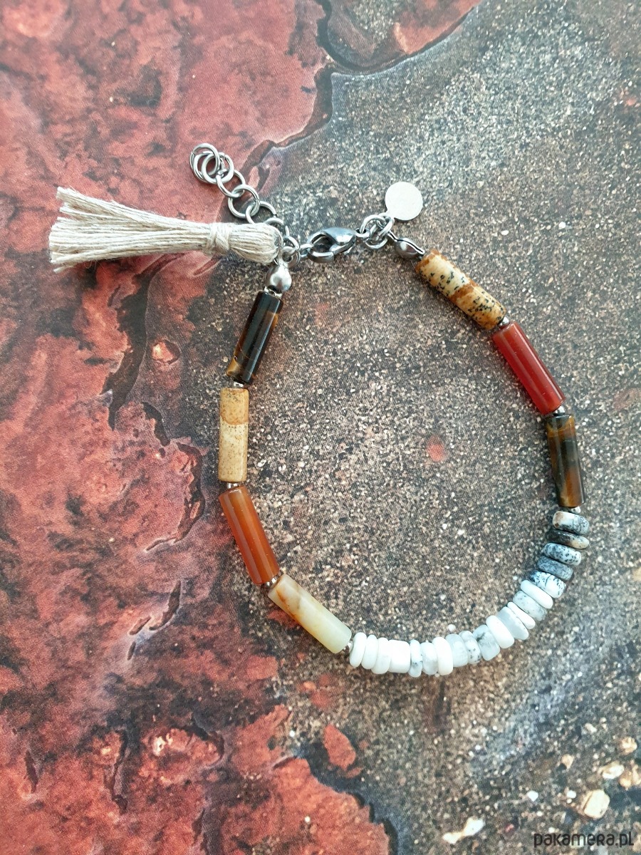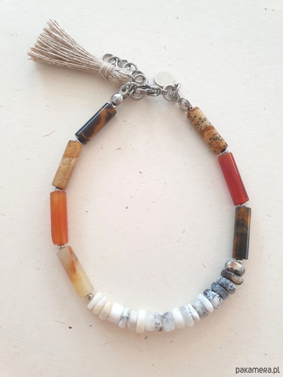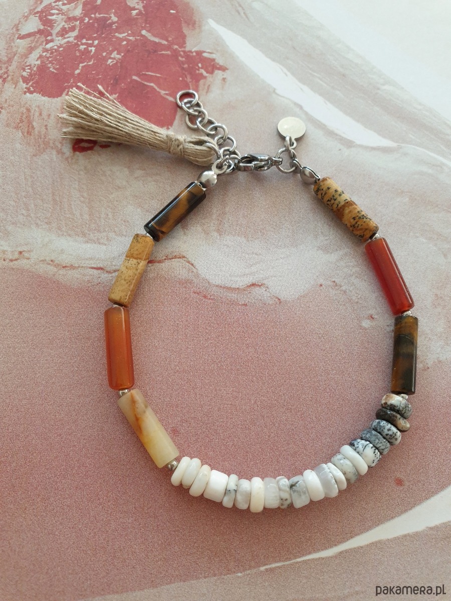 Minimalistyczna bransoletka tworzona ręcznie z kamieni naturalnych, elementów ze stali szlachetnej (antyalergicznej) i lnianego chwosta. W tej - patyczki agat, jaspis obrazkowy, tygrysie oko, amazonit oponki opal dendrytowy.